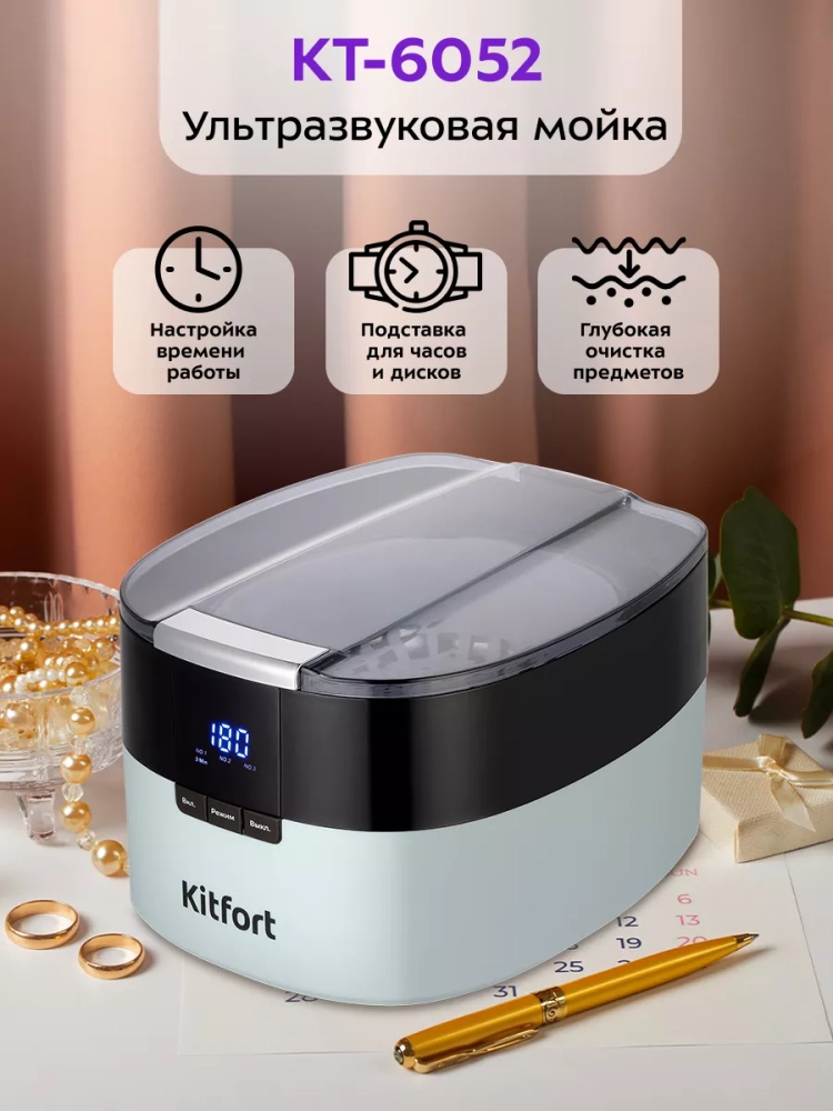 Ультразвуковая мойка Kitfort КТ-6052 поможет эффективно очистить и продезинфицировать небольшие изделия из металла, пластика и стекла. Ультразвуковая очистка — способ очистки поверхности твёрдых тел в жидкости, при котором в жидкость вводятся ультразвуковые колебания. Применение ультразвука значительно ускоряет процесс очистки и повышает качество очистки. В качестве жидкости в ультразвуковой мойке можно использовать воду, а также чистящие или дезинфицирующие растворы.