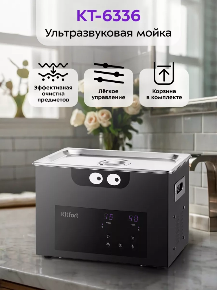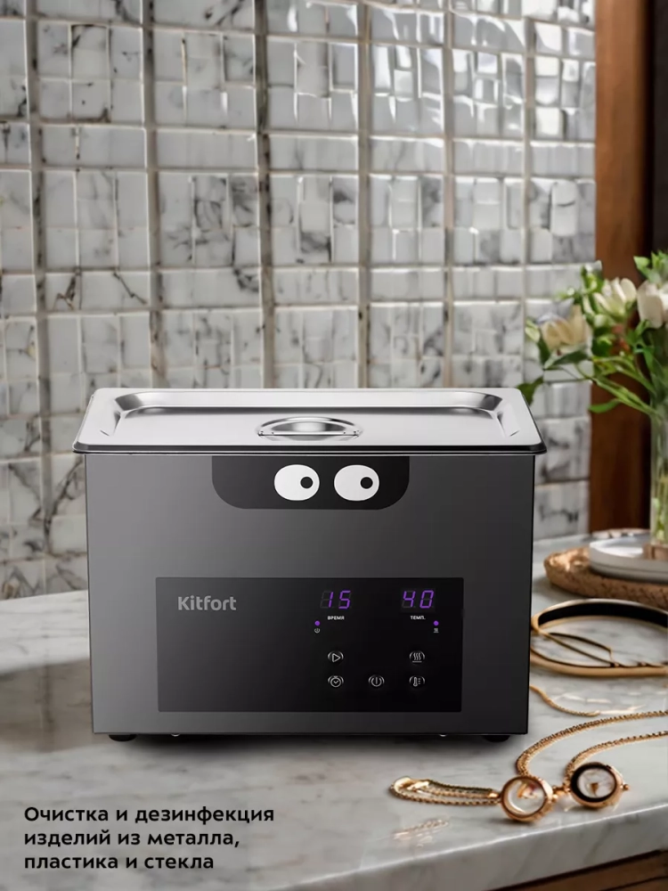 Ультразвуковая мойка Kitfort КТ-6336 поможет эффективно очистить и продезинфицировать небольшие изделия из металла, пластика и стекла. Ультразвуковая очистка — способ очистки поверхности твёрдых тел в жидкости, при котором в жидкость вводятся ультразвуковые колебания. Применение ультразвука значительно ускоряет процесс очистки и повышает качество очистки. В качестве жидкости в ультразвуковой мойке можно использовать воду, а также специальные чистящие или дезинфицирующие растворы.