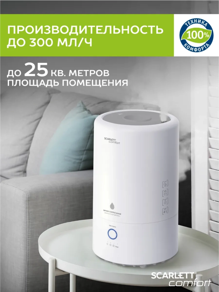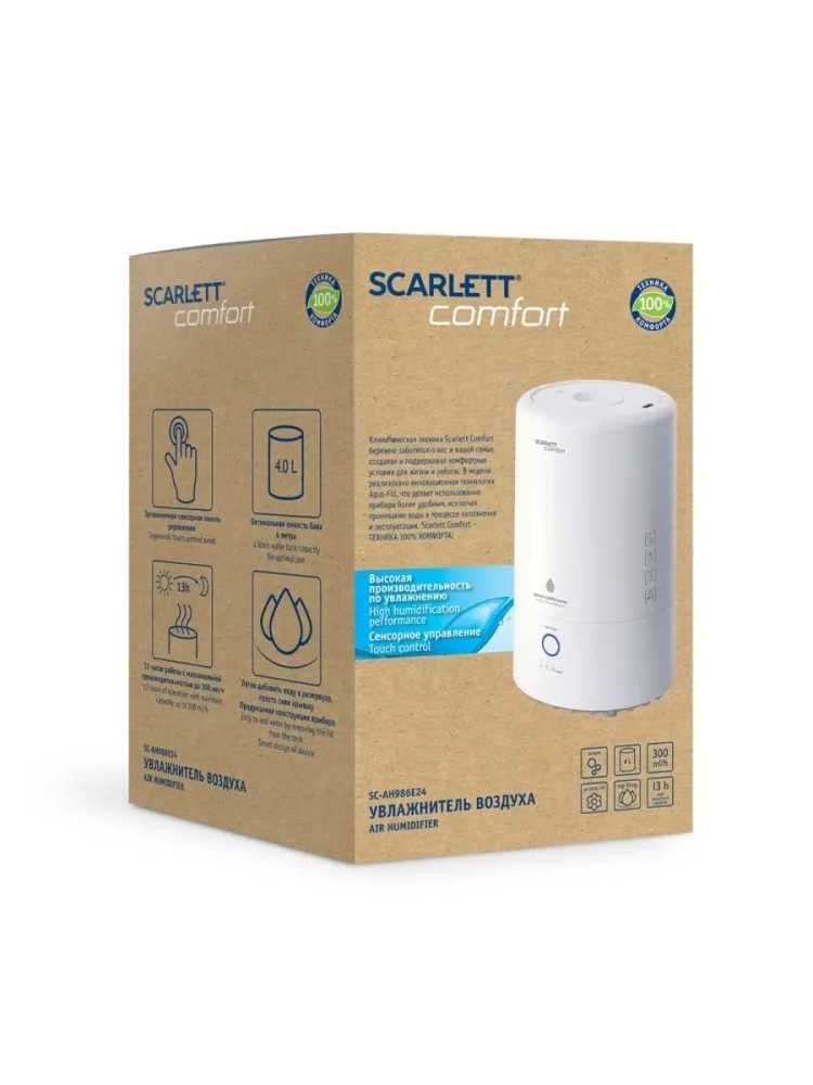 Увлажнитель воздуха SC-AH986E24 оснащен функцией верхнего долива воды для максимально комфортного использования прибора. Нет необходимости выемки резервуара, что позволяет избежать разбрызгивания воды. Для создания приятной и ароматной атмосферы, достаточно лишь добавить несколько капель аромамасла в капсулу. Резервуар вмещает в себя 4.0 литра воды, чего достаточно для увлажнения помещения площадью до 25 квадратных метров. Увлажнитель имеет три скорости выхода пара, которые регулируются легким касанием по сенсорной панели, а также встроенный гигростат c функцией SMART- увлажнения, которая автоматически регулирует скорость выхода пара, относительно влажности воздуха в помещении, что помогает создать оптимальный микроклимат. При отсутствии воды в увлажнителе, прибор автоматически отключается для сохранения длительного срока службы.