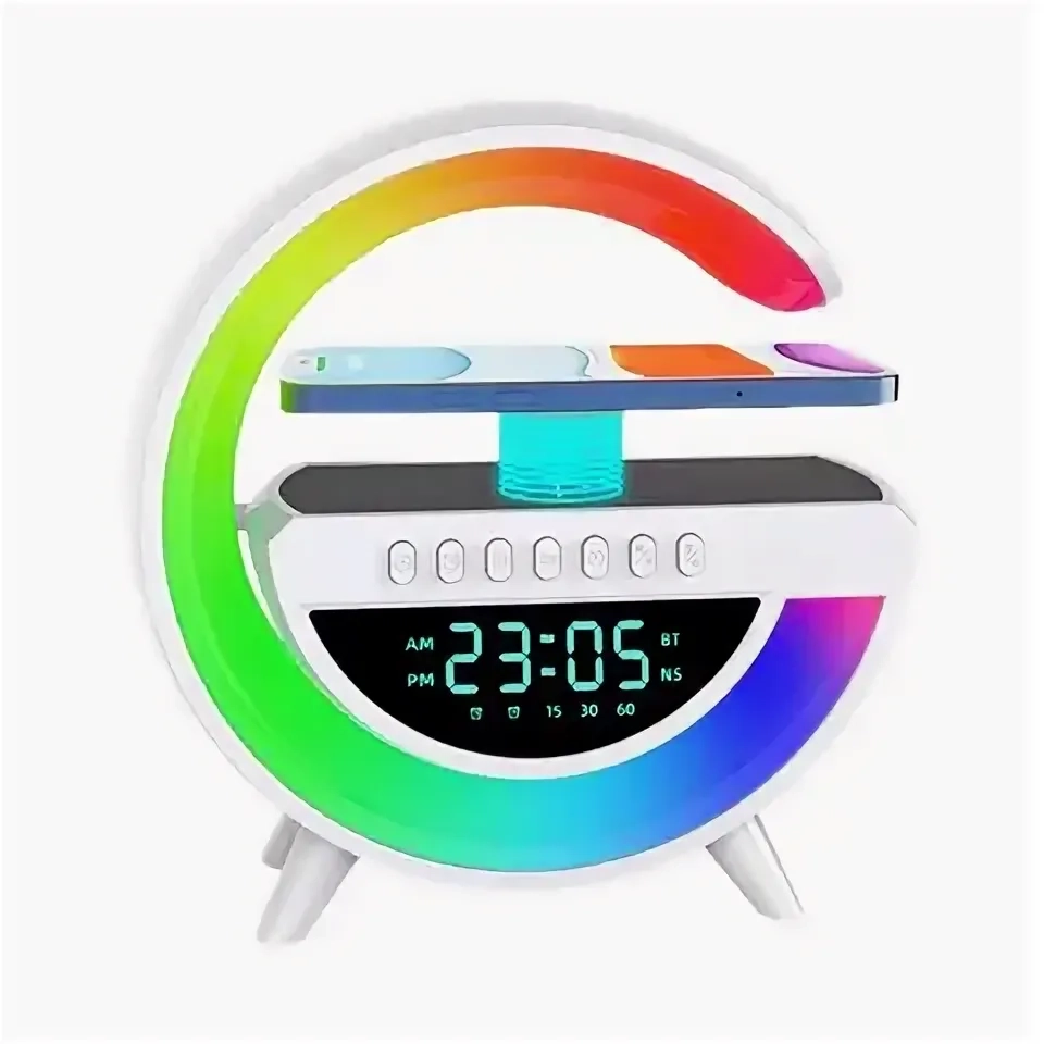 Эта умная настольная лампа со встроенным громким динамиком и дисплеем, часами и функцией беспроводной быстрой зарядки на 10 Ватт станет отличным дополнением к вашему интерьеру. Аудиотехника с технологией bluetooth позволит легко передавать музыку с вашего телефона на колонку, создавая потрясающую атмосферу в комнате на столе либо на прикроватной тумбочке. Акустическая система этой переносной лампы обладает портативностью, что делает ее идеальным выбором для использования дома или на даче. Цифровая панель с подставкой для заряда ваших телефонов это не только светильник с rgb цветом и led подсветкой, но и универсальный помощник, через который вы можете ответить на звонок. Светильник поможет детям читать книги и оставлять на ночь мягкий приглушенный свет используя его как ночник. Благодаря наличию света вы сможете создать настроение с помощью разноцветной ргб подсветки, которая чудесно подойдет как для чтения, так и для расслабляющего отдыха. Встроенный будильник поможет вам всегда быть вовремя, а функция зарядки мобильного смартфона позволит удобно заряжать свой смартфон прямо со столика возле кровати. Данная проводная колонка отличается не только мощным звучанием, но и стильным дизайном. Ее эргономичные ножки обеспечивают устойчивость на поверхности, а минималистичный вид позволяет легко вписать ее в любое помещение. Устройство совместимо с различными смартфонами, а также имеет возможность использования через зарядный разъем питания usb typec, aux-кабель или tf-флешкой. Современная станция с технологией вт блютуз должна быть не только функциональной, но и стильной – эта аудиосистема является ярким примером того, как комбинировать функциональность с красотой проигрываемой музыки. Детская комната, спальня или гостиная – везде эта инновационная светящаяся техника будет приносить удовольствие от прослушивания музыкальных треков. Система домашней аккустики с многофункциональностью и зарядкой от сети, благодаря ножкам может быть напольным ночником. Управление колонкой и светом возможно через приложение на телефоне.