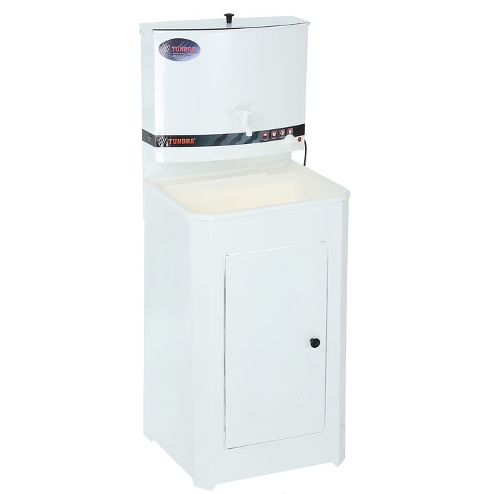 Умывальник TUNDRA — отличное приобретение для дачи, гаража, мастерской или других мест без центрального водоснабжения. Металлическая конструкция белого цвета проста в эксплуатации и уходе, обладает высокой износоустойчивостью. Раковина выполнена из пластика, а на бак для воды нанесено невосприимчивое к коррозии запатентованное покрытие. Огромное преимущество — наличие встроенного водонагревателя, который будет особенно актуален в прохладную погоду.