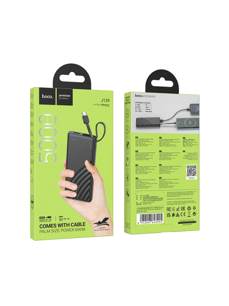 Универсальный Доп. Аккумулятор 5000mAh, J129, HOCO, 1 USB (5V/2A), провод Type-C, черный