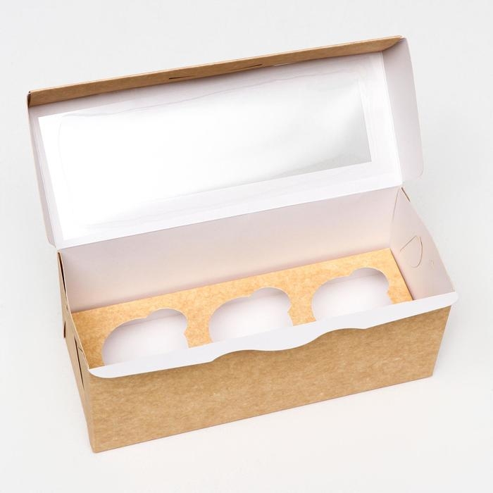Упаковка на 3 капкейка с окном, крафт, 25 х 10 х 10 см