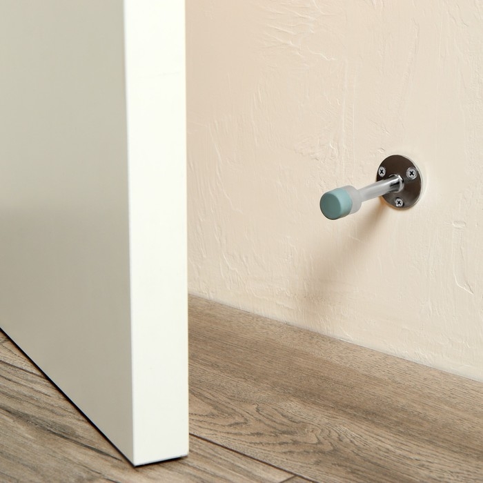 Упор крепится на стену или дверь. Он уменьшает угол открытия двери и защищает стены и мебель от случайного удара.