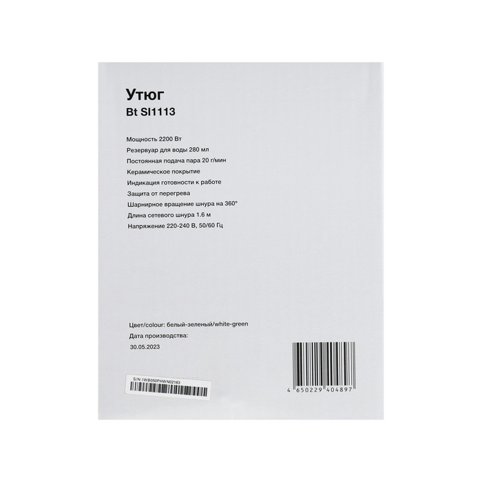 Утюг Blackton Bt SI1113, 2200 Вт, керамическая подошва, 20 г/мин, 280 мл, бело-зелёный