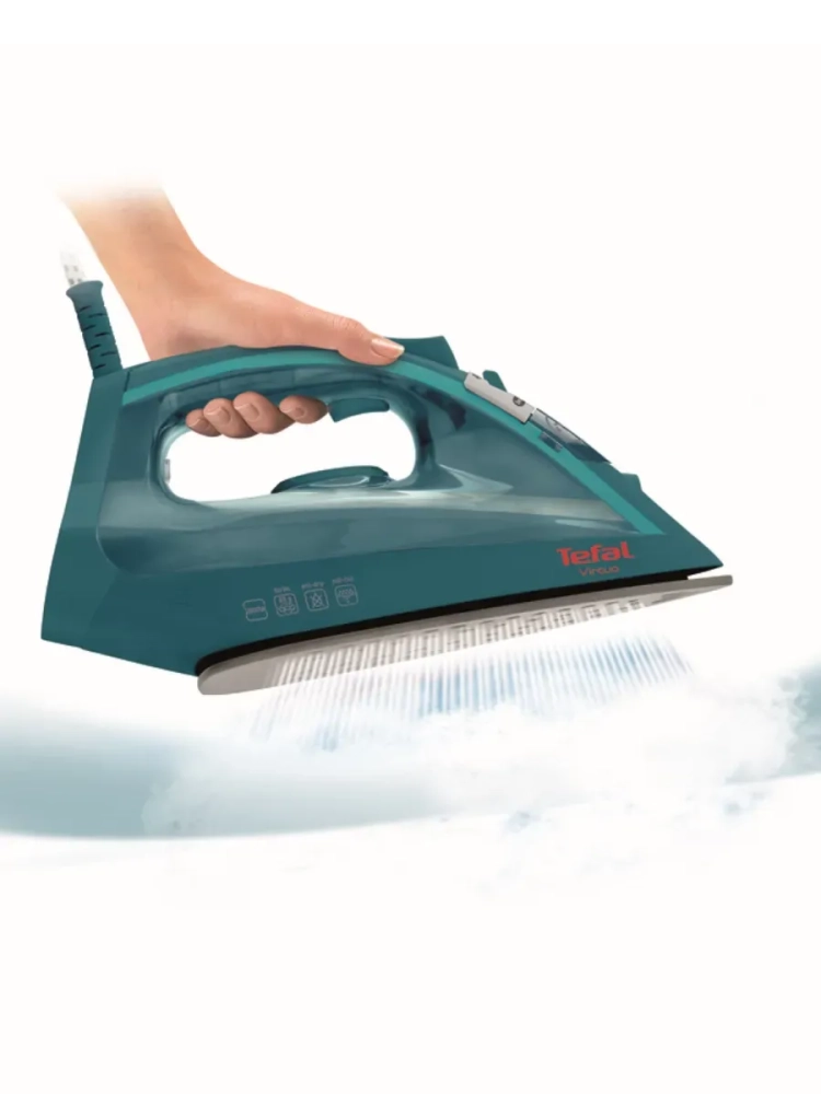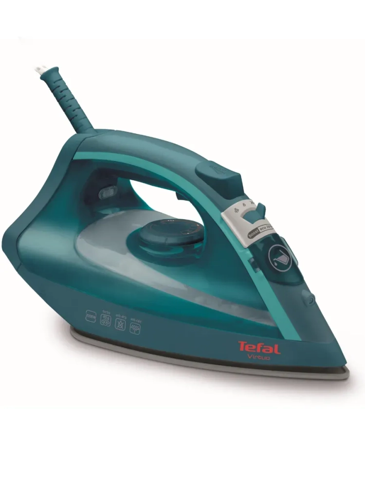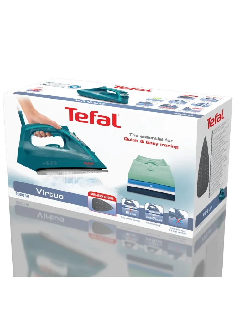 Утюг Tefal Virtuo FV1712E0. Быстрое и легкое глажение с отличным результатом. Утюг Virtuo от Tefal создан для быстрого и удобного глажения. Паровой утюг обладает мощностью 2000 Вт и создает постоянный пар 24 г/мин для эффективного глажения при каждом использовании. Утюг Virtuo от Tefal сочетает удобство использования и компактный дизайн. Антипригарная подошва и эргономичный триггер подачи пара обеспечивают простое и комфортное глажение. Функция «Капля-стоп» предотвращает появление пятен на вашей одежде во время глажения. Быстрое и качественное глажение еще никогда не было таким простым и удобным.
