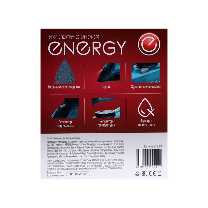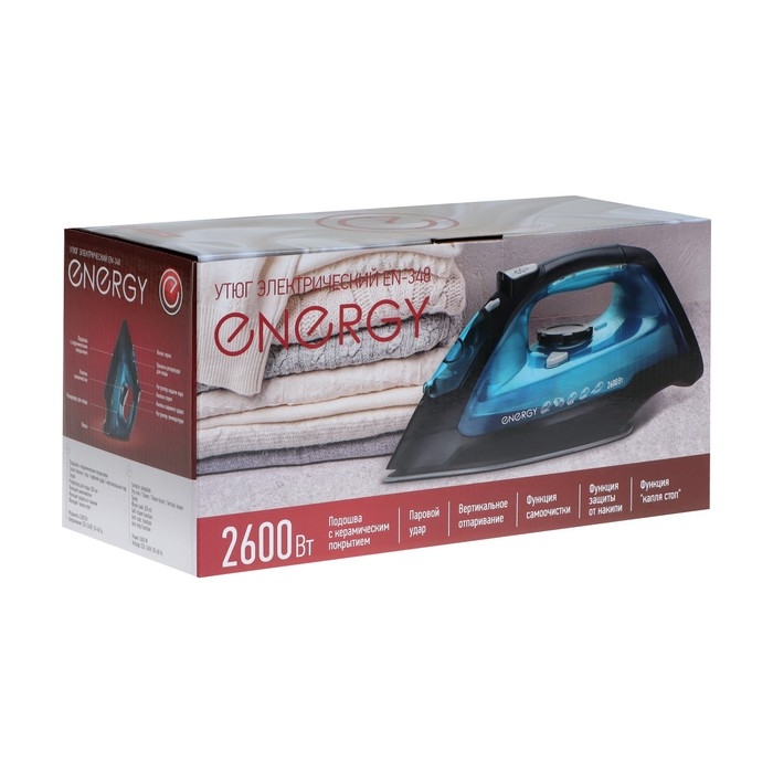Утюг ENERGY EN-348, 2600 Вт, керамическая подошва, 350 мл, чёрно-бирюзовый