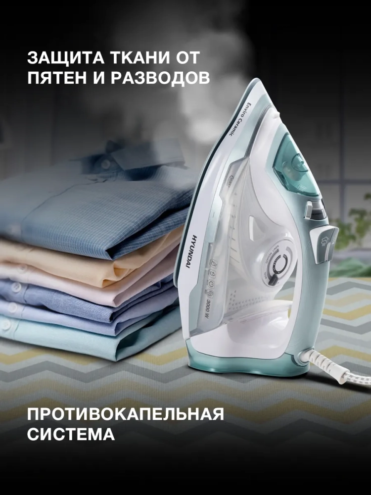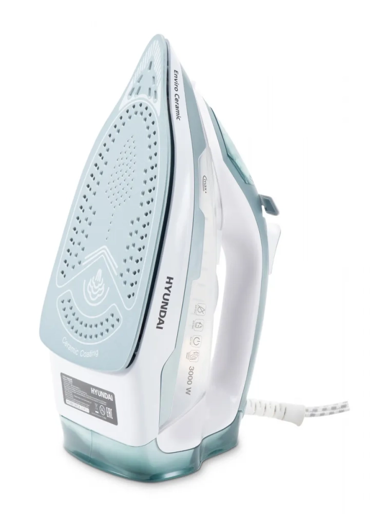 Утюг Hyundai H-SI01223 белый/изумрудный, мощность 3000Вт, подошва утюга керамическая Enviro Ceramic, паровой удар 220г, емкость для воды 420мл, длина шнура 3м