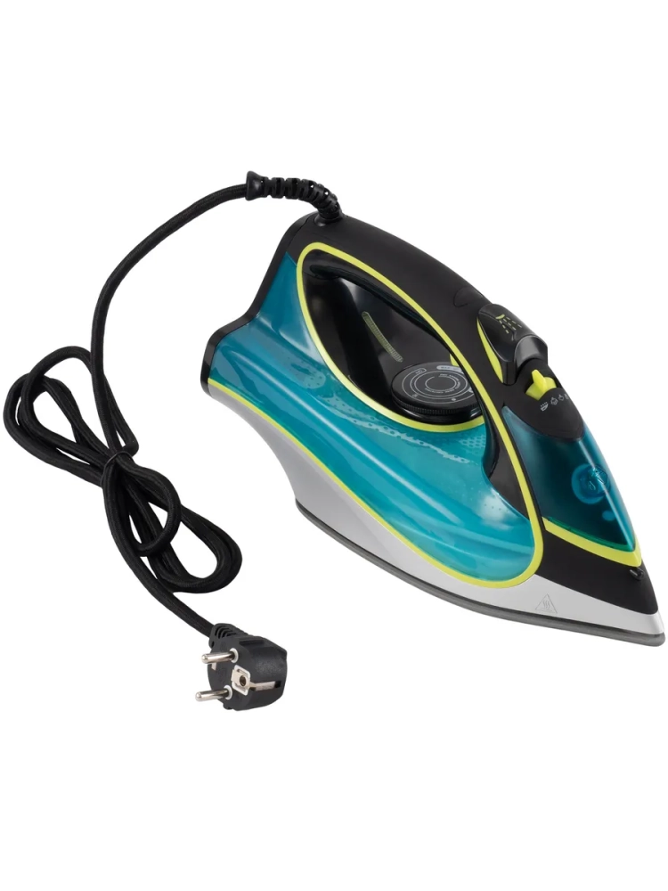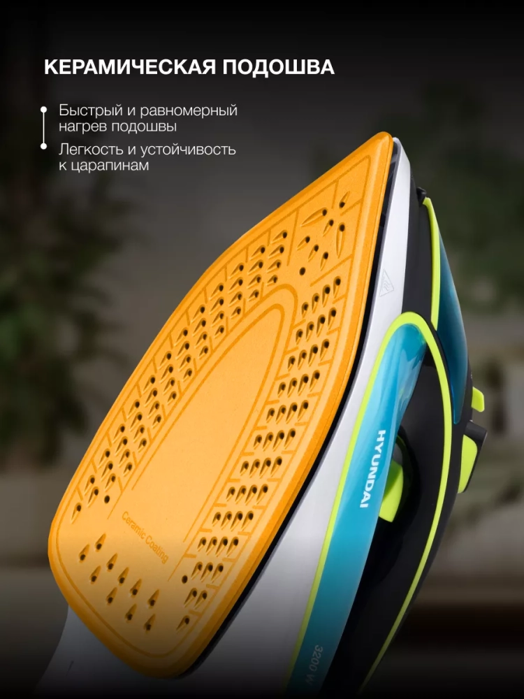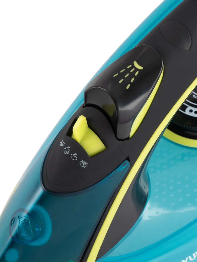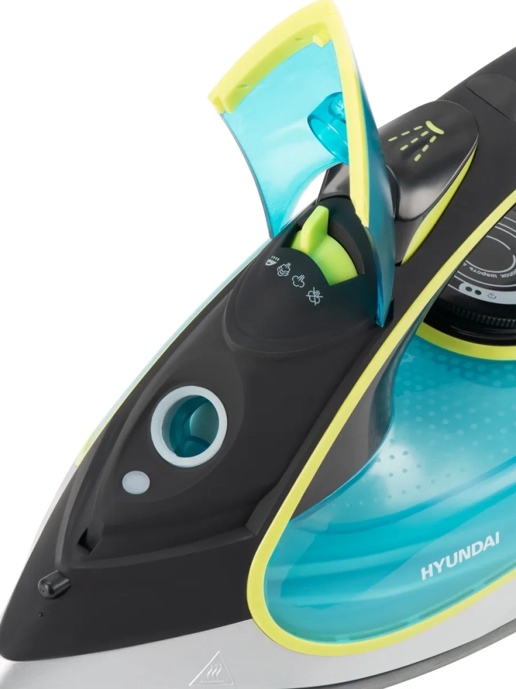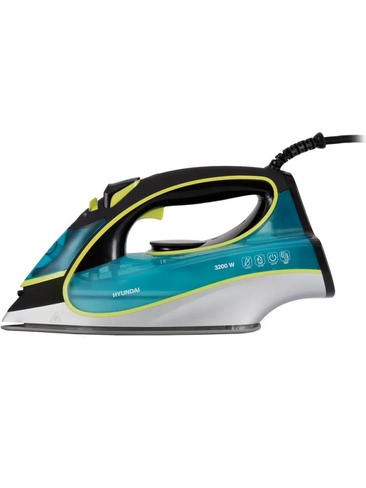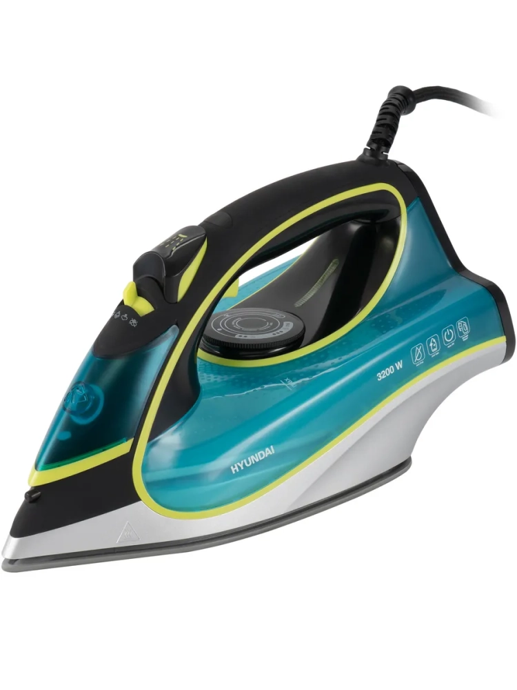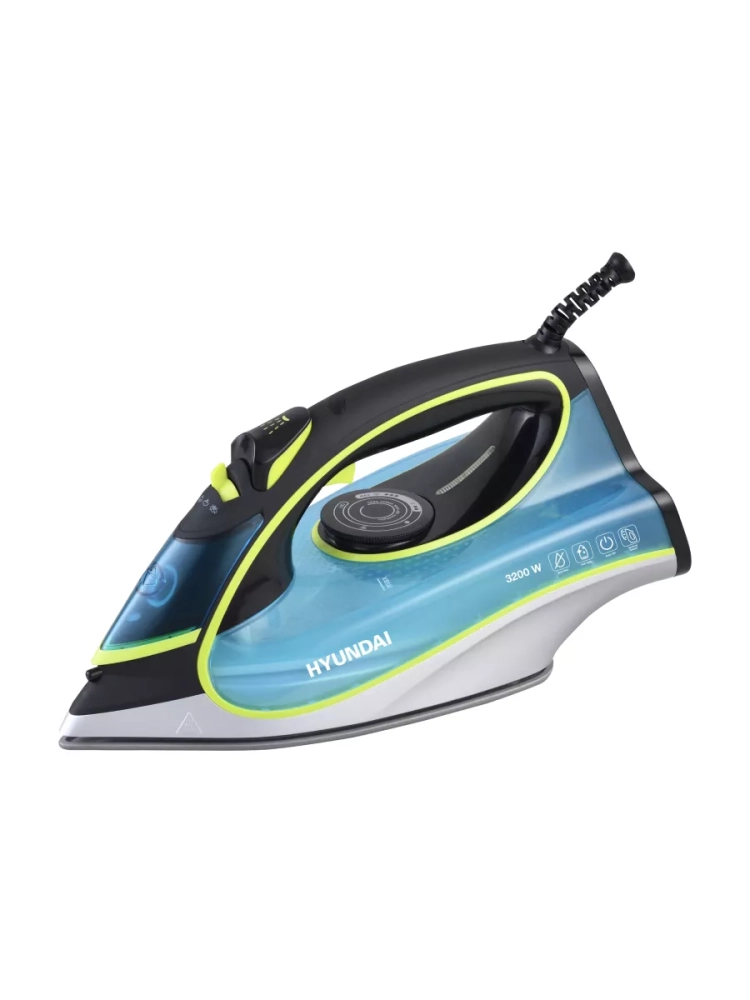 Утюг Hyundai H-SI01450 голубой/желтый, мощность 3200Вт, подошва утюга керамическая Enviro Ceramic, паровой удар 220г, емкость для воды 450мл, длина шнура 2м.