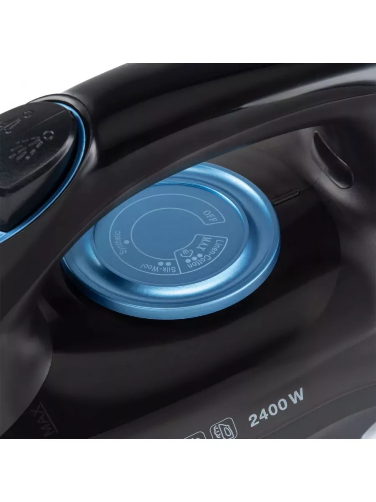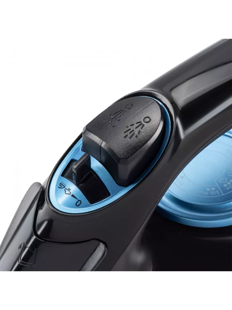 Утюг Hyundai H-SI01557 черный/голубой, мощность 2400Вт, подошва утюга керамическая Enviro Ceramic, паровой удар 160г, емкость для воды 250мл, длина шнура 2м.