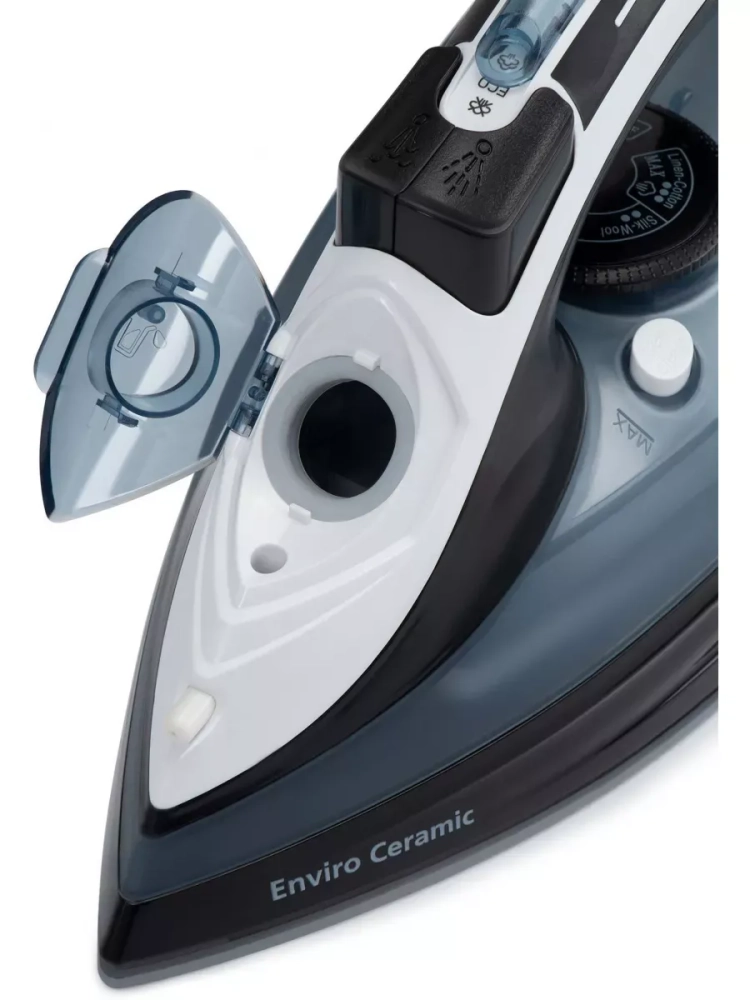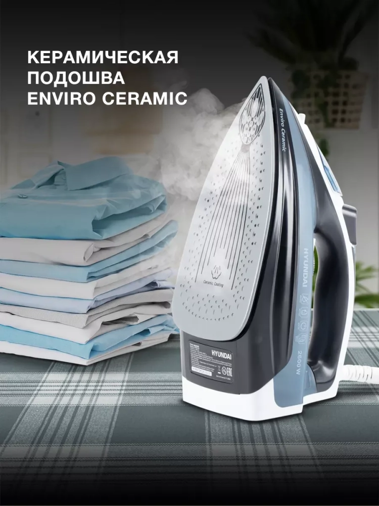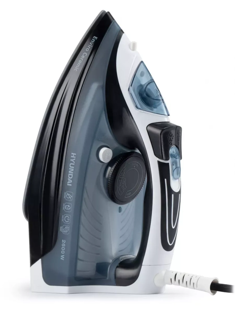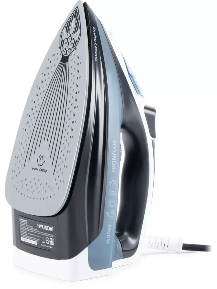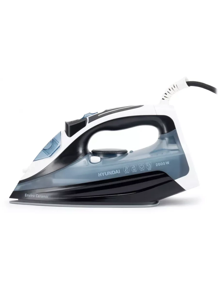 Утюг Hyundai H-SI01573 черный/синий, мощность 2600Вт, подошва утюга керамическая Enviro Ceramic, паровой удар 180г, емкость для воды 300мл, длина шнура 2м.