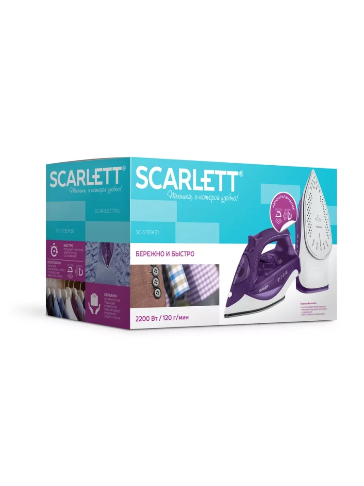 Утюг Scarlett SC-SI30K51 с пластиковым корпусом бело-фиолетового цвета снабжен идеально гладкой подошвой с керамическим покрытием KeramoPro, которая обеспечивает отличное скольжение и бережное отношение ко всем видам тканей. Прибор с мощностью 2200 Вт легко скользит по поверхности любой ткани и может эффективно отпаривать вещи, постоянно выдавая до 60 граммов пара в минуту в режиме глажения с паром. В режиме парового удара прибор создает 120 гр пара в минуту, расправляя даже самые непослушные складки. Есть возможность вертикального отпаривания: получится приводить в порядок пальто или костюмы на вешалке. Утюг снабжен автоотключением: выключится вовремя, если оставить его без присмотра в течение 30 сек в горизонтальном положении и 8 мин - в вертикальном. Вес оптимальный - способствует разглаживанию неровностей без излишней нагрузки на руки. Система защиты от накипи вместе с системой самоочистки существенно продлит срок службы утюга и убережет его конструктивные элементы от накипи.