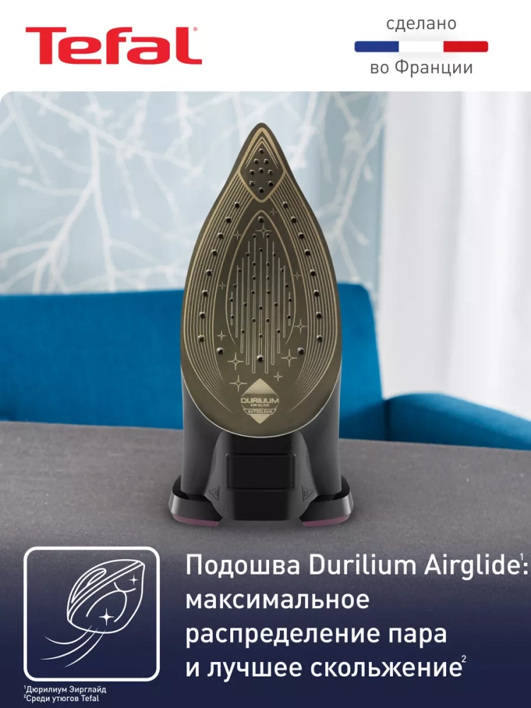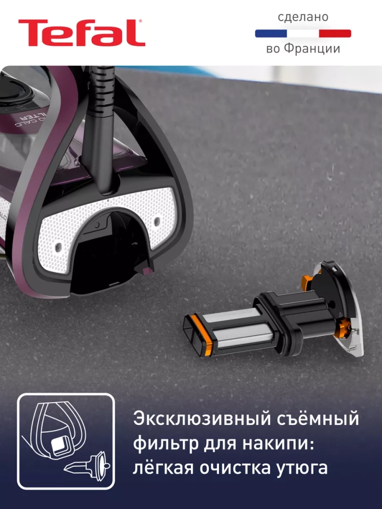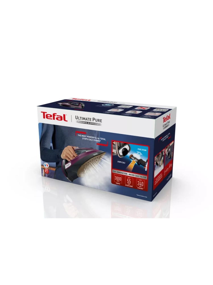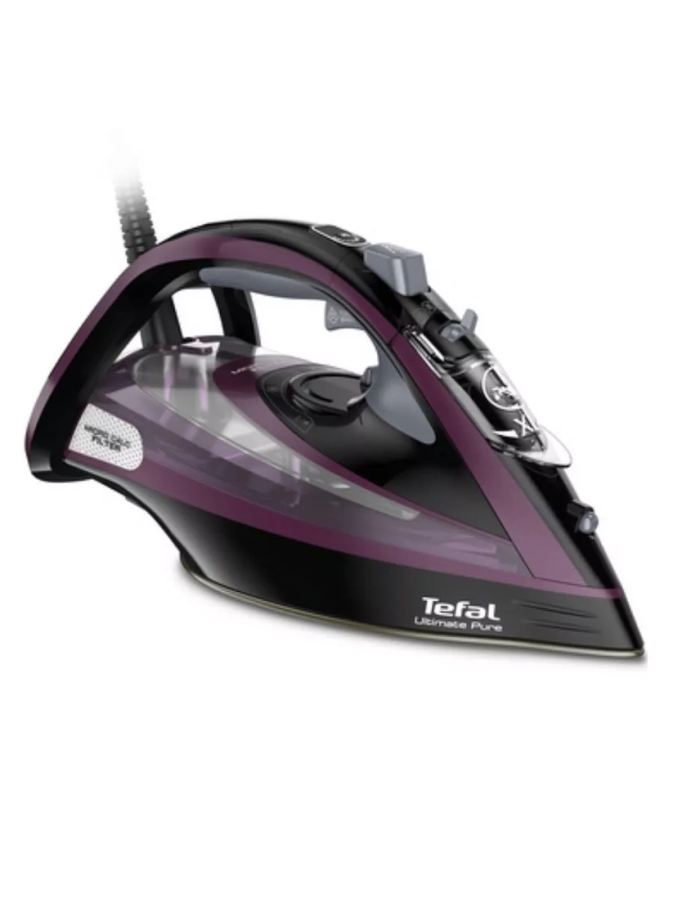 Утюг Tefal Ultimate Pure FV9835E0. Паровой утюг Ultimate Pure от Tefal соединяет в себе мощный пар и эксклюзивную систему защиты от накипи, чтобы вы могли увидеть по-настоящему качественный результат. Инновационная эксклюзивная система фильтрации Micro Calc предотвращает попадание частичек накипи или образование пятен от нее на одежде во время глажения.