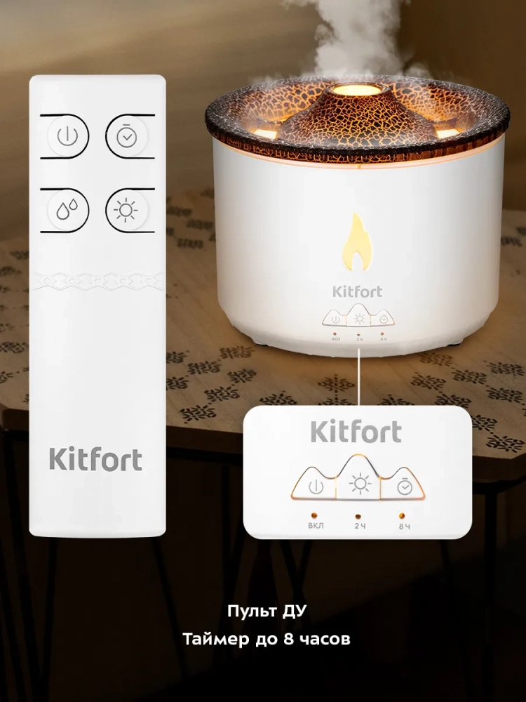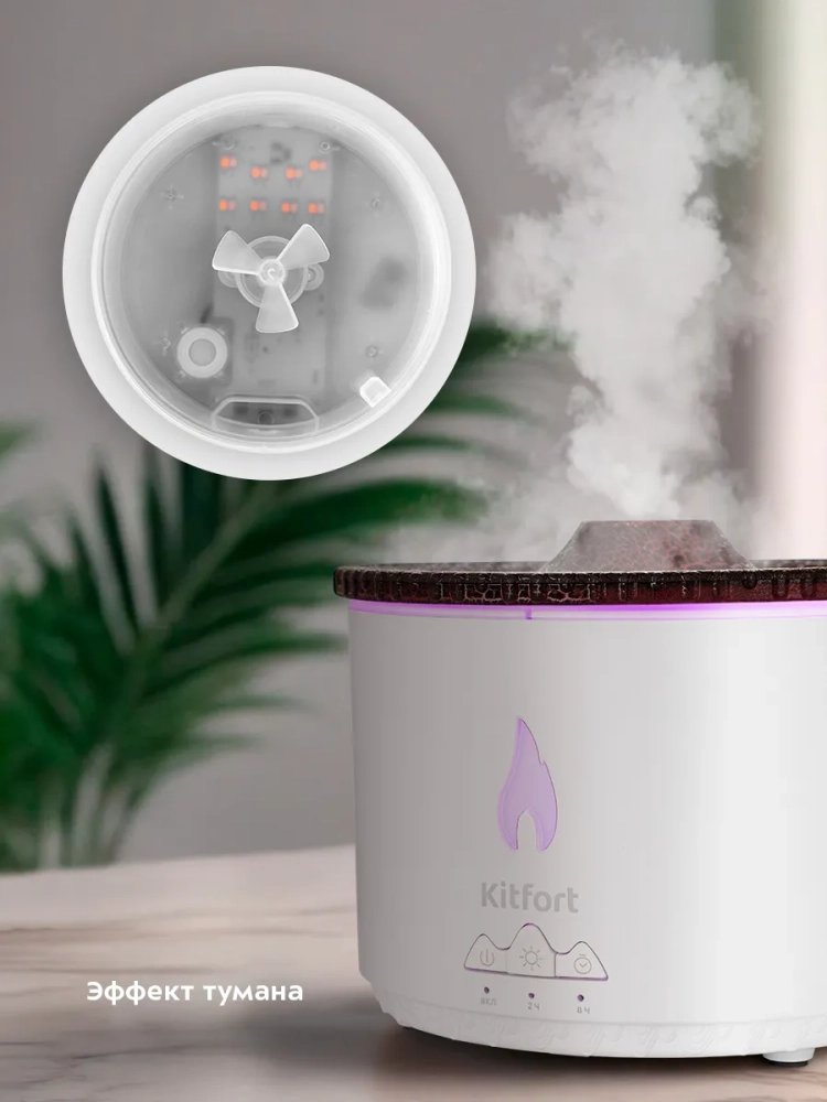 Благодаря подсветке и туману увлажнитель-ароматизатор при импульсной подаче тумана создает эффект вулкана, а при непрерывной подаче тумана — эффект пламени.