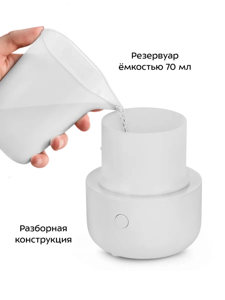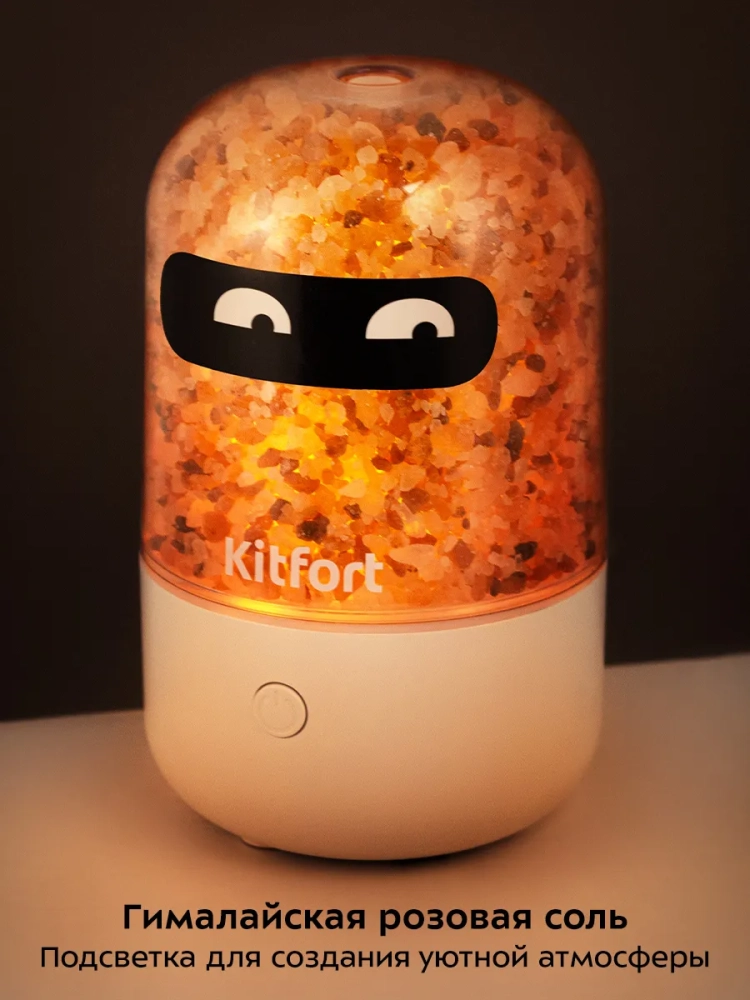 У устройства простое управление одной кнопкой. Увлажнитель имеет один режим подачи тумана. В декоративной крышке находится гималайская розовая соль, благодаря которой после включения подсветки свет красиво рассеивается, создавая уютную атмосферу.