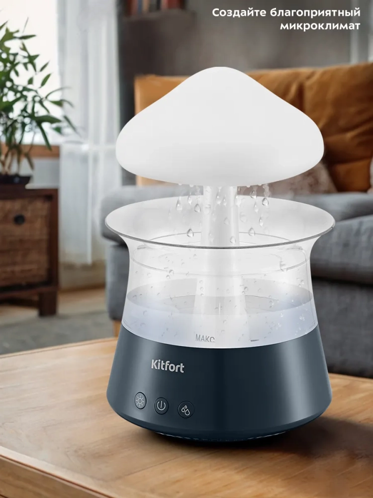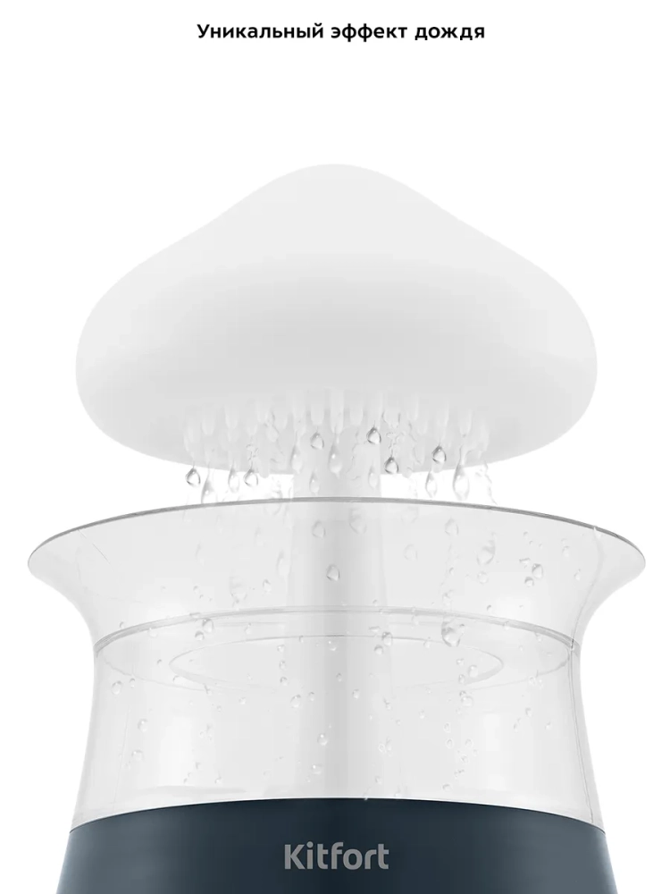 Особенностью увлажнителя-ароматизатора КТ-3838 является эффект дождя, который возникает за счет подачи воды сверху вниз насосом в корпусе устройства. Вода по каплям выходит из отверстий в верхней части устройства, выполненной в виде облака, создавая таким образом визуальный и шумовой эффект дождевых капель. Звук дождя успокаивающе действует на нервную систему и помогает быстрее заснуть. При желании данный эффект можно отключить. Излучатель, создающий туман, и водяной насос, подающий воду, могут работать одновременно или по отдельности. Кроме того, вы можете использовать устройство как ночник, включив подсветку с плавной сменой семи цветов или выбрав один цвет подсветки, который будет гореть непрерывно или мягко затухать и загораться снова.