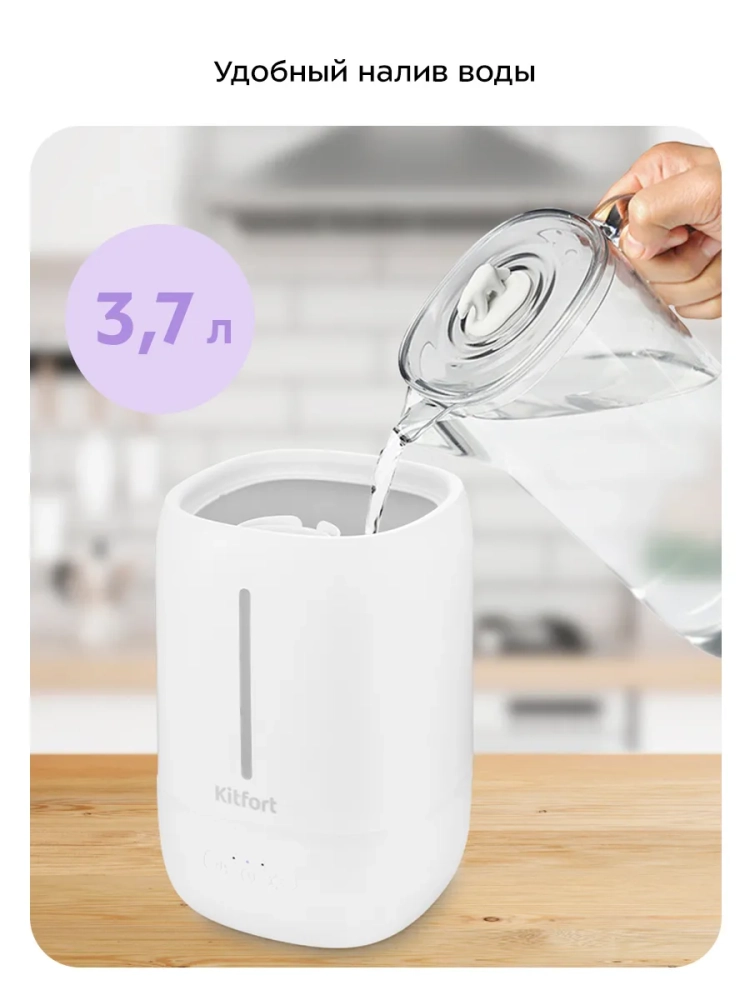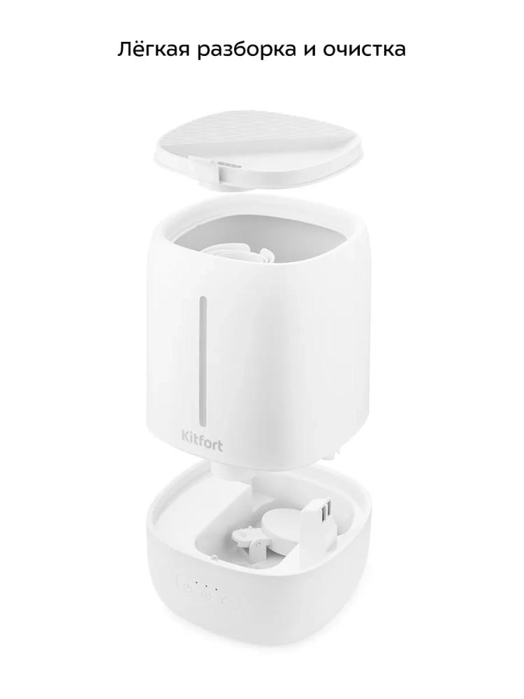Ультразвуковой увлажнитель воздуха Kitfort KT-2831 увлажняет воздух в помещении, создавая хороший микроклимат для проживания людей. КТ-2831 простой в эксплуатации и обслуживании, отличается высокой надежностью в работе. Может использоваться в помещениях, площадь которых не превышает 25 кв. м. Данный увлажнитель компактный, прост как в использовании, так и в обслуживании. Ультразвуковые увлажнители считаются наиболее эффективными из существующих увлажнителей воздуха. Принцип работы такого увлажнителя прост. Внутри него стоит пьезокерамический излучатель, погруженный в воду, который с помощью ультразвуковых колебаний выбивает с поверхности воды мельчайшие капельки воды, создавая водяной туман. Этот туман выдувается наружу небольшим вентилятором, а затем разносится по объему помещения естественными воздушными потоками. Частицы тумана мелкие, они обладают большой суммарной поверхностью, а потому быстро испаряются, что приводит к повышению относительной влажности воздуха.