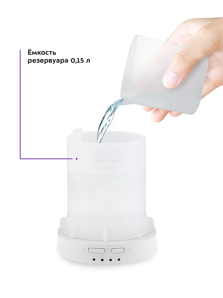 У устройства простое и легкое управление двумя кнопками. Увлажнитель имеет два режима подачи тумана: непрерывный и импульсный. В импульсном режиме подача тумана будет циклически включаться на 15 секунд, затем выключаться на 15 секунд. Есть возможность включить таймер на 1 или 3 часа, в течение этого времени устройство будет работать в непрерывном режиме. Можно включить подсветку с плавной сменой цветов или выбрать один цвет подсветки. Устройство можно использовать как ночник, не включая подачу тумана.