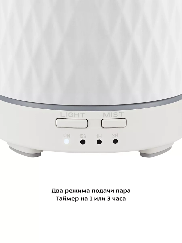 У устройства простое и легкое управление двумя кнопками. Увлажнитель имеет два режима подачи тумана: непрерывный и импульсный. В импульсном режиме подача тумана будет циклически включаться на 15 секунд, затем выключаться на 15 секунд. Есть возможность включить таймер на 1 или 3 часа, в течение этого времени устройство будет работать в непрерывном режиме. Можно включить подсветку с плавной сменой цветов или выбрать один цвет подсветки. Устройство можно использовать как ночник, не включая подачу тумана.