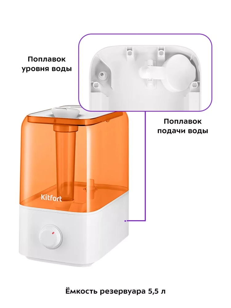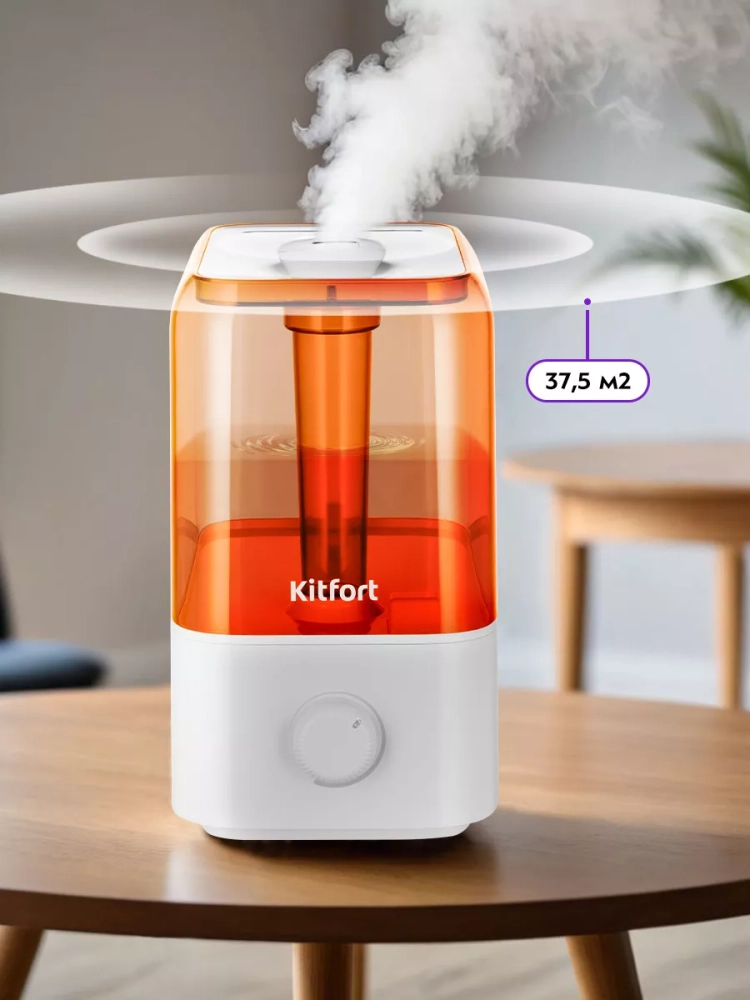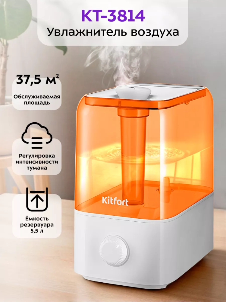 УУльтразвуковой увлажнитель воздуха Kitfort KT-3814 увлажняет воздух в помещении, создавая хороший микроклимат для проживания людей. Увлажнитель КТ-3814 прост в эксплуатации и обслуживании и может использоваться в помещениях, площадью 17,5–37,5 м² (в зависимости от интенсивности тумана). Интенсивность тумана плавно регулируется. Индикация показывает, когда устройство включено и когда в увлажнителе нет воды.