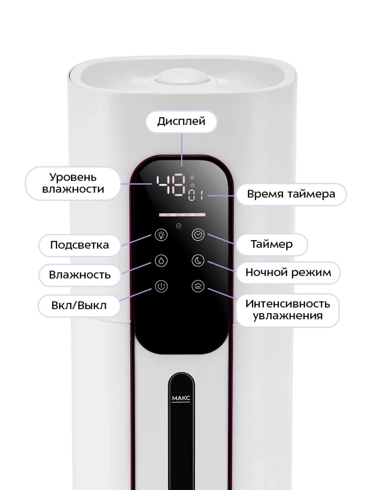 Таймер работы увлажнителя: 1–14 ч с шагом 1 ч.