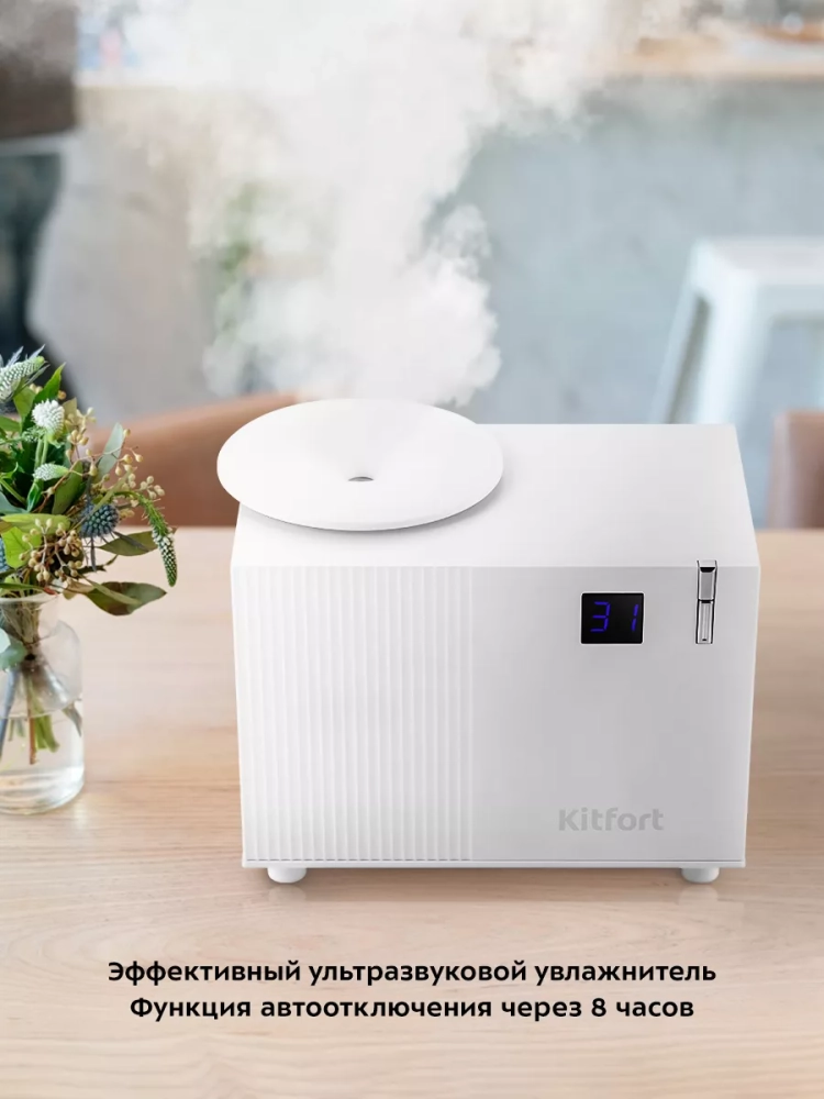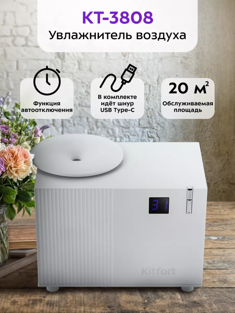 Увлажнитель воздуха Kitfort КТ-3808 — компактный портативный прибор, который создаст благоприятный микроклимат рядом с вами. Он будет увлажнять воздух вокруг области его размещения, поэтому можно комфортно находиться на рабочем месте, крепко спать или заниматься любыми другими делами, пока рядом с вами находится увлажнитель воздуха. Увлажнитель прост в эксплуатации и обслуживании и может использоваться в помещениях площадью не более 20 м².