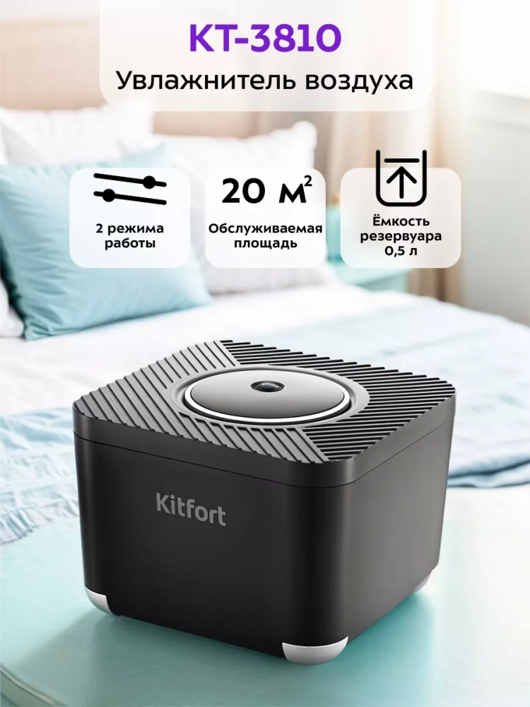 Увлажнитель воздуха Kitfort КТ-3810 — компактный портативный прибор, который создаст благоприятный микроклимат рядом с вами. Он будет увлажнять воздух вокруг области его размещения, поэтому можно комфортно находиться на рабочем месте, крепко спать или заниматься любыми другими делами, пока рядом с вами находится увлажнитель воздуха. Увлажнитель прост в эксплуатации и обслуживании и может использоваться в помещениях площадью не более 20 м².