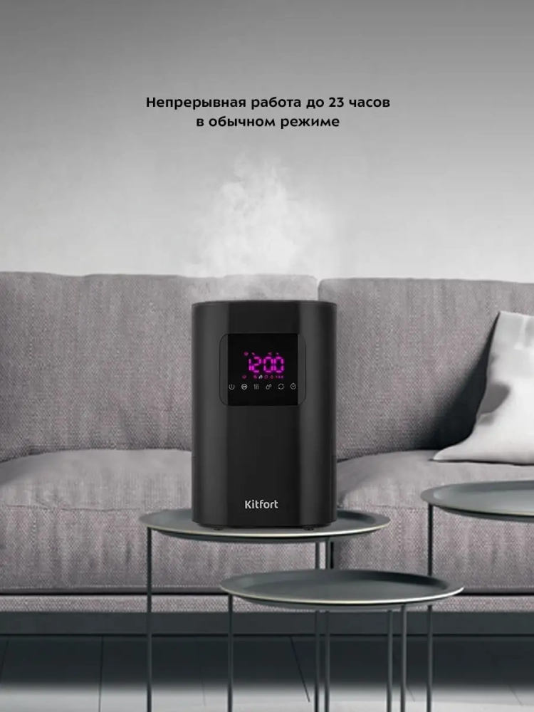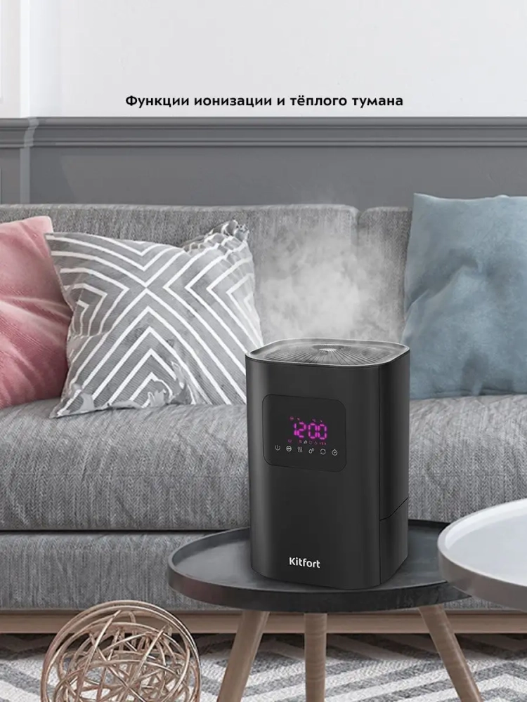 Ультразвуковой увлажнитель воздуха Kitfort KT-2874 увлажняет воздух в помещении, создавая хороший микроклимат для проживания людей. Данная модель увлажнителя воздуха имеет функции ионизации и теплого тумана, а также автоматический режим. Есть возможность установить таймер отключения от 1 до 12 часов с шагом 1 час и выбрать один из трех уровней интенсивности тумана. На дисплее отображается температура и влажность в помещении.