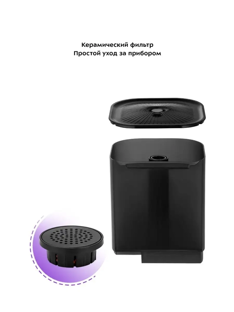 Резервуар для воды съемный, поэтому его удобно наполнять водой. В резервуаре увлажнителя расположен керамический фильтр, благодаря которому вода очищается от примесей и становится мягче за счет снижения в ней концентрации минеральных веществ.