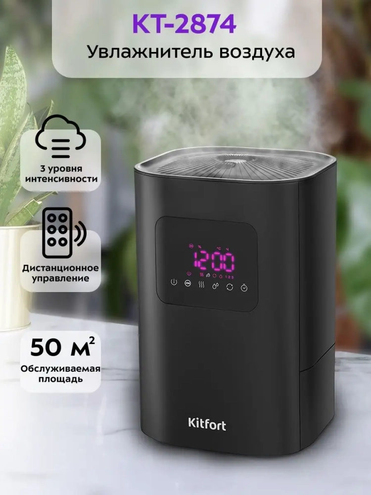 КТ-2874 простой в эксплуатации и обслуживании, отличается высокой надежностью в работе. Может использоваться в помещениях, площадь которых не превышает 40–50 м². Управлять увлажнителем можно с помощью сенсорных кнопок на основании увлажнителя или с помощью пульта дистанционного управления.