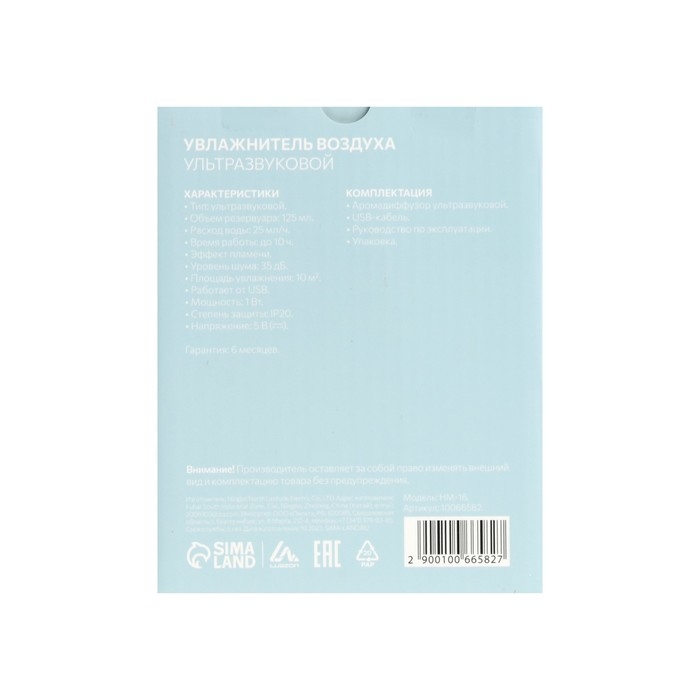 Увлажнитель воздуха Luazon HM-16, ультразвуковой, 125 мл, 1 Вт, USB Type-C, белый