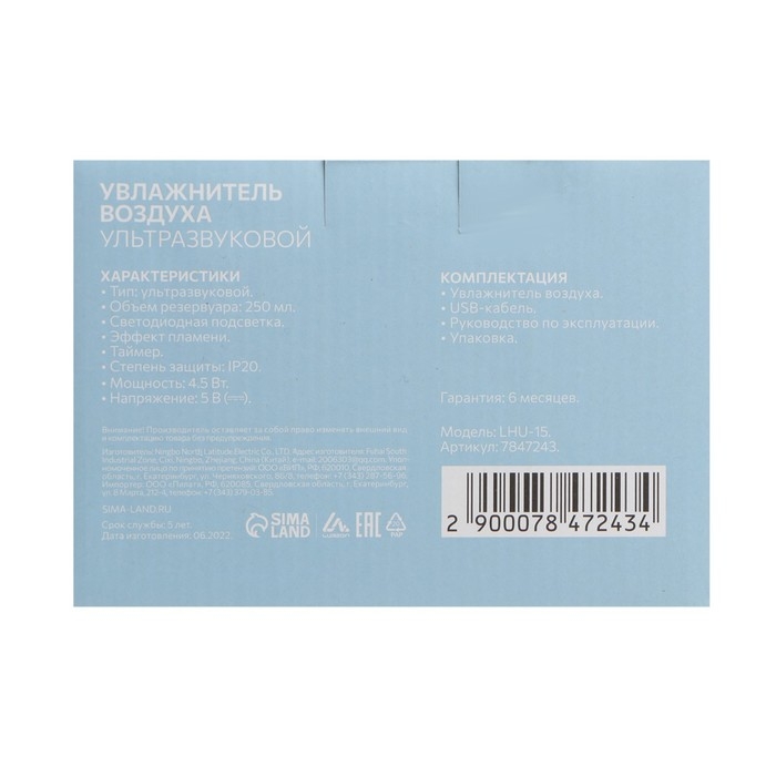 Увлажнитель воздуха Luazon LHU-15, ультразвуковой, 250 мл, 4.5 Вт, 3 режима, подсветка