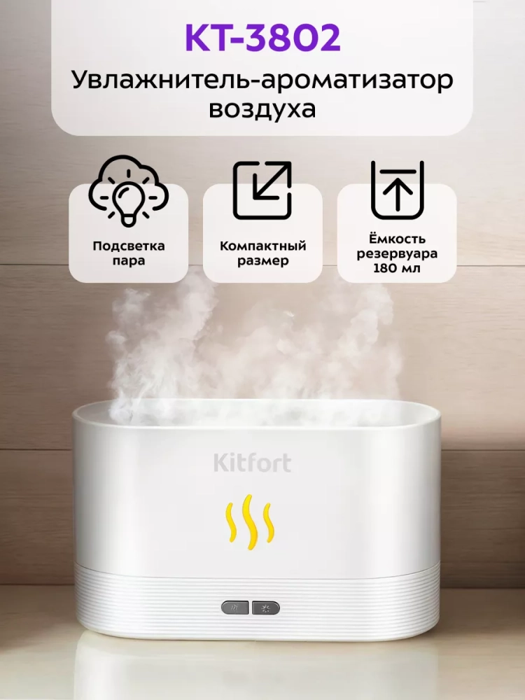 Увлажнитель-ароматизатор воздуха Kitfort KT-3802 — компактный прибор, который создаст благоприятный микроклимат рядом с вами. Добавьте в резервуар для воды несколько капель ароматического масла на водной основе, чтобы во время работы прибора ароматическое вещество испарялось и вместе с туманом выдувалось наружу потоком воздуха, создавая вокруг приятный и ненавязчивый аромат. Устройство будет увлажнять воздух вокруг области его размещения, поэтому можно комфортно находиться на рабочем месте, крепко спать или заниматься любыми другими делами, пока рядом с вами находится увлажнитель-ароматизатор воздуха.