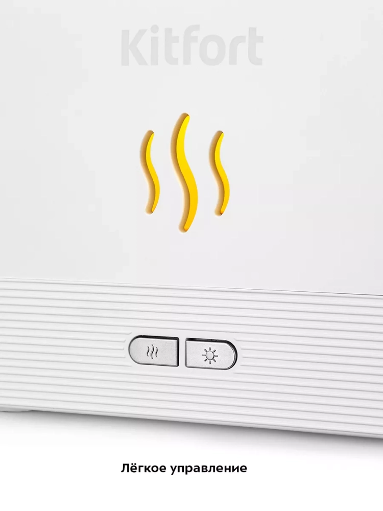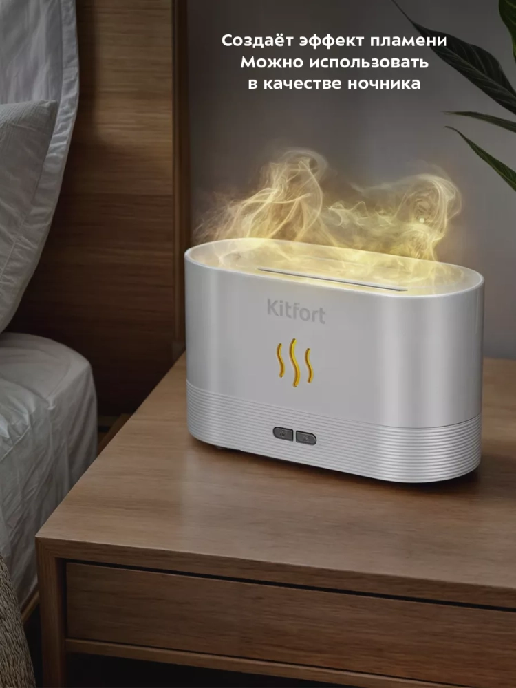 У устройства простое и легкое управление двумя кнопками. Вы можете использовать устройство как ночник, не включая подачу тумана. При включенной подаче тумана и подсветке создается эффект пламени.
