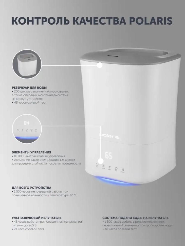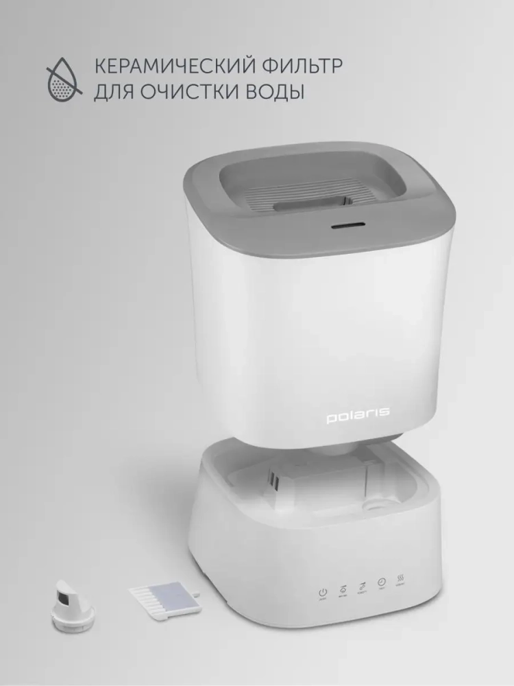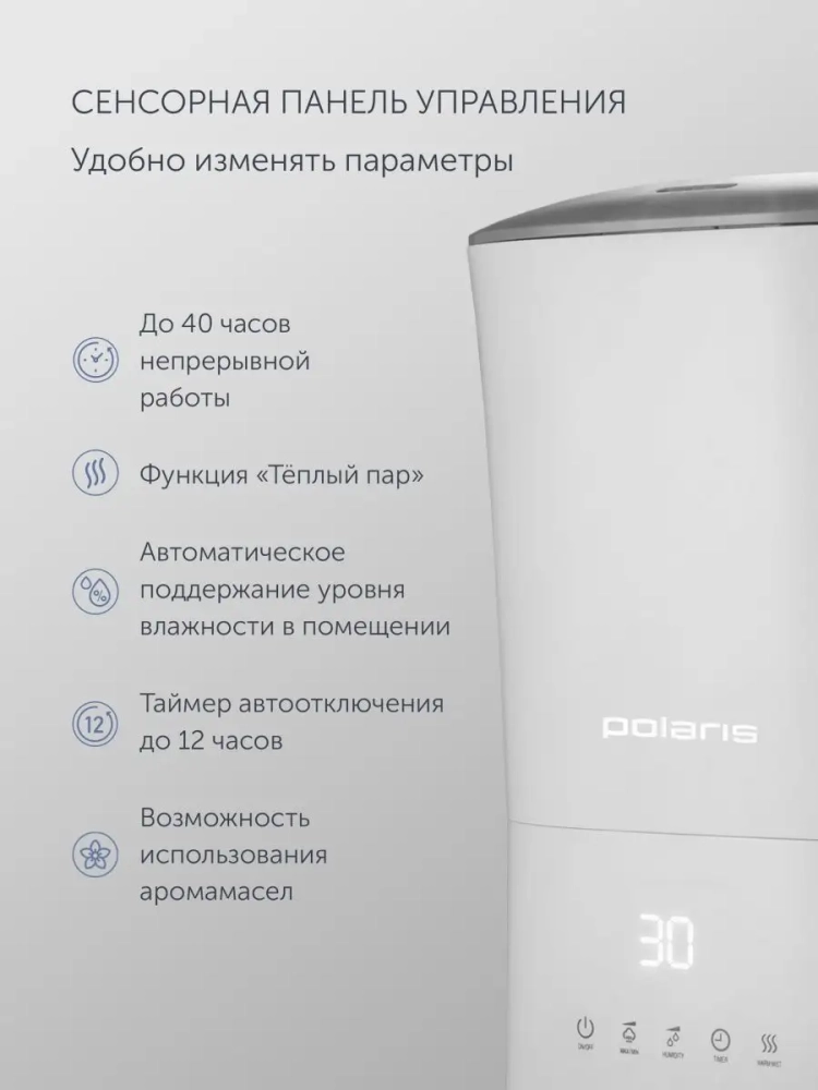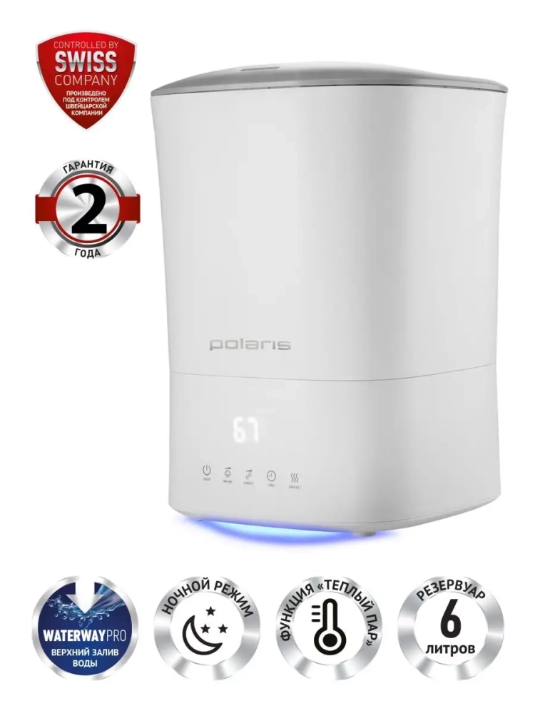 Новая технология верхнего залива "WATERWAY PRO" – для залива воды достаточно снять крышку. Многофункциональный LED дисплей. Резервуар для воды: 6 л. Сенсорная панель управления. 3 скорости подачи пара. Функция "Теплый пар". Автоматическое поддержание уровня влажности в помещении. Индикация влажности и температуры. Электронный гигрометр. Керамический фильтр очистки воды. Возможность использования аромамасел. Встроенный ночной светильник. Таймер автоматического отключения до 12 часов. Ночной режим. Автоматическое отключение при отсутствии воды и при снятии бака с основания. До 40 часов непрерывной работы. Расход воды: 400 мл/ч. Рекомендуемая площадь: до 60 м². Мощность: 110 Вт.