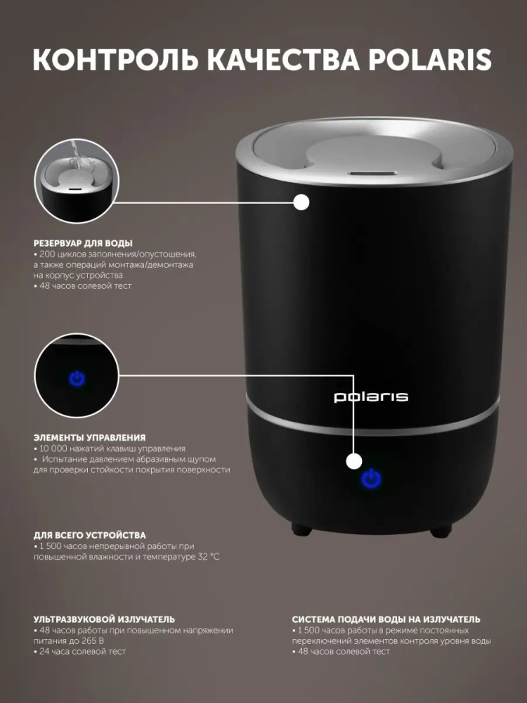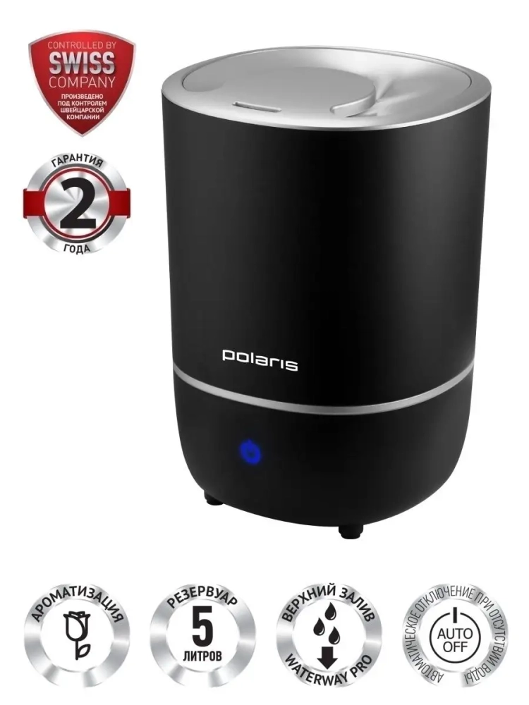 **Новая технология верхнего залива "WATERWAY PRO" - для залива воды достаточно снять крышку. Сенсорная панель управления. Резервуар для воды: 5 л.** 3 скорости подачи пара. Автоматическое отключение при отсутствии воды. Возможность использования аромамасел. Расход воды: до 350 мл/ч. До 25 часов непрерывной работы. Рекомендуемая площадь: до 40 квадратных метров. Мощность: 30 Вт.
