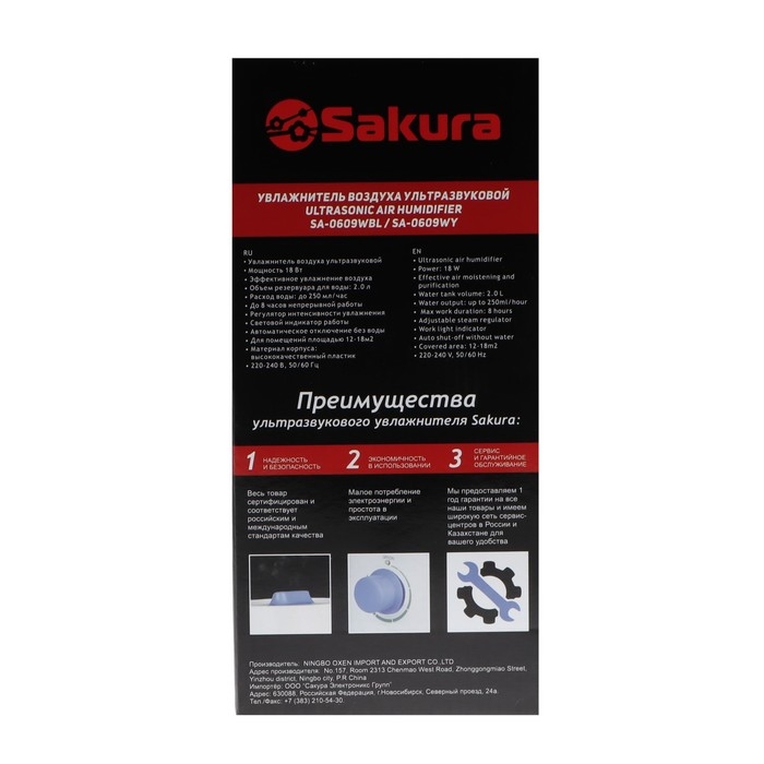 Увлажнитель воздуха Sakura SA-0609WBL, ультразвуковой, 18 Вт, 2 л, до 18 м2, бело-голубой