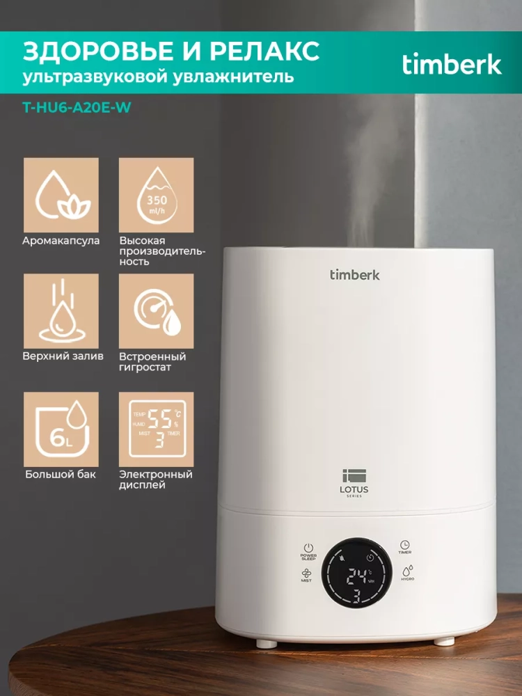 Сенсорное электронное управление. LED - Дисплей. Удобное добавление воды сверху. Производительность – 350 мл/ч - позволяет быстро достичь оптимального уровня влажности. Большая емкость бака - 6 литров. Аромакапсула для насыщения кислорода фитонцидами, подавляющими рост и развитие бактерий. Гигростат – регулировка уровня влажности окружающего воздуха (от 45% до 80%). Ночной режим с уменьшением яркости дисплея. Таймер на отключение от 1 до 12 часов. Продолжительность работы при максимальной производительности без долива воды - до 18 часов. Три скорости подачи пара. Автоматическое отключение при отсутствии воды. Мощность прибора – 23 Вт. Верхний залив воды. Гигростат. Аромакапсула.