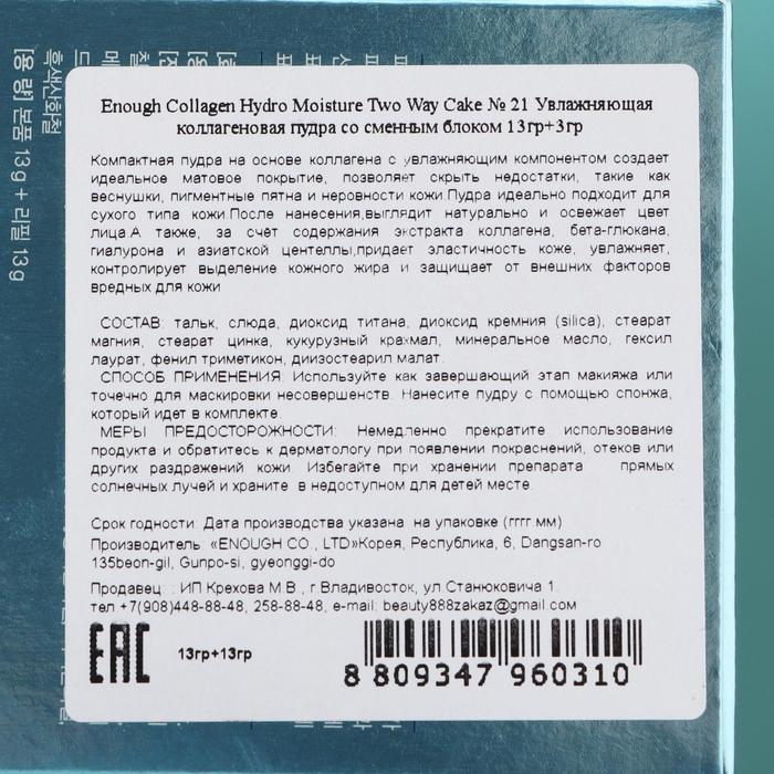 Увлажняющая пудра Enough с коллагеном, тон №21 натуральный бежевый + запасной блок