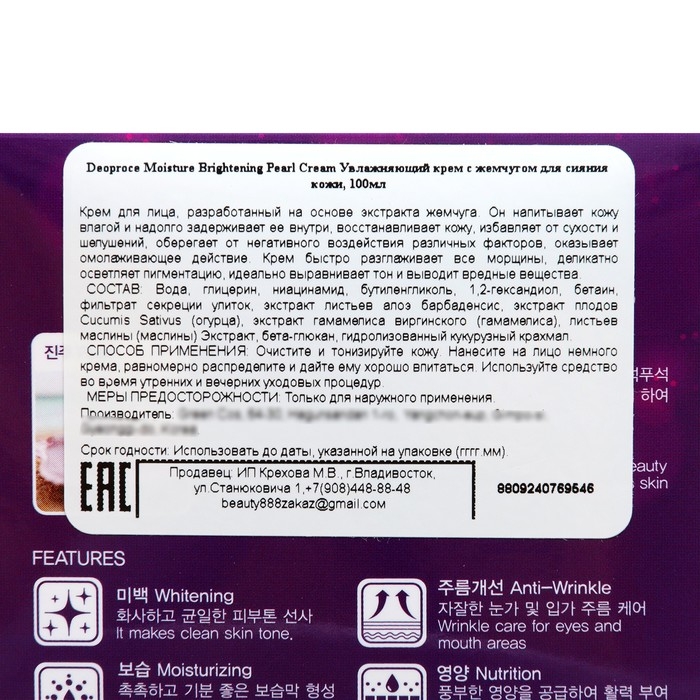 Увлажняющий крем Deoproce с жемчугом разработан для обеспечения коже интенсивного увлажнения и придания ей здорового сияния. Вот ключевые характеристики этого продукта:
