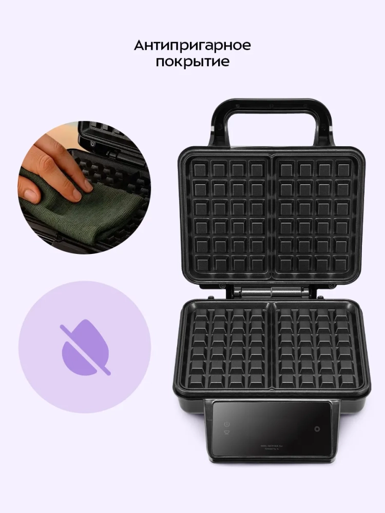 Антипригарное покрытие панелей не дает прилипнуть тесту в процессе приготовления и позволяет готовить с минимальным количеством масла или без него. Также антипригарное покрытие облегчает чистку панелей.