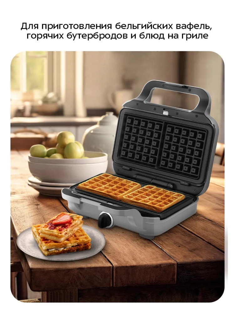 Вафельница для бельгийских вафель КТ-5605 от kitfort — это многофункциональный электрический прибор, который станет незаменимым помощником на вашей кухне. Эта электровафельница позволяет готовить не только вкусные вафли, но и разнообразные бутерброды в бутерброднице, панини и сэндвичи в сендвичнице. Благодаря трем парам съемных панелей и насадок вы сможете легко переключаться между режимами приготовления: панели для вафель, бутербродов и гриля обеспечат вам множество кулинарных возможностей. Электрический гаджет оснащен антипригарным покрытием на панелях, что позволяет готовить с минимальным количеством масла и облегчает процесс чистки. Высокая температура нагрева способствует быстрому приготовлению блюд. Вафельница, она же сэндвичница, работает при напряжении 220–240 В и имеет мощность 900 Вт. Конструкция техники предусматривает приготовление пищи с закрытой крышкой — продукты находятся между двумя нагреваемыми поверхностями, что ускоряет процесс готовки без необходимости переворачивания еды. Зажим на ручке удерживает крышку в закрытом состоянии для удобства транспортировки и хранения. Бытовой электро прибор оснащен индикаторами питания и нагрева, а также термостатом для регулировки температуры. Термопредохранитель защищает устройство от перегрева: в случае превышения допустимой температуры электроцепь разрывается автоматически. Длина шнура составляет 0,7 м, а размеры устройства — 275 × 265 × 112 мм. Размеры панели составляют 268 × 151 мм. Этот кухонный гаджет идеально подходит как для дома, так и для профессиональной кухни.