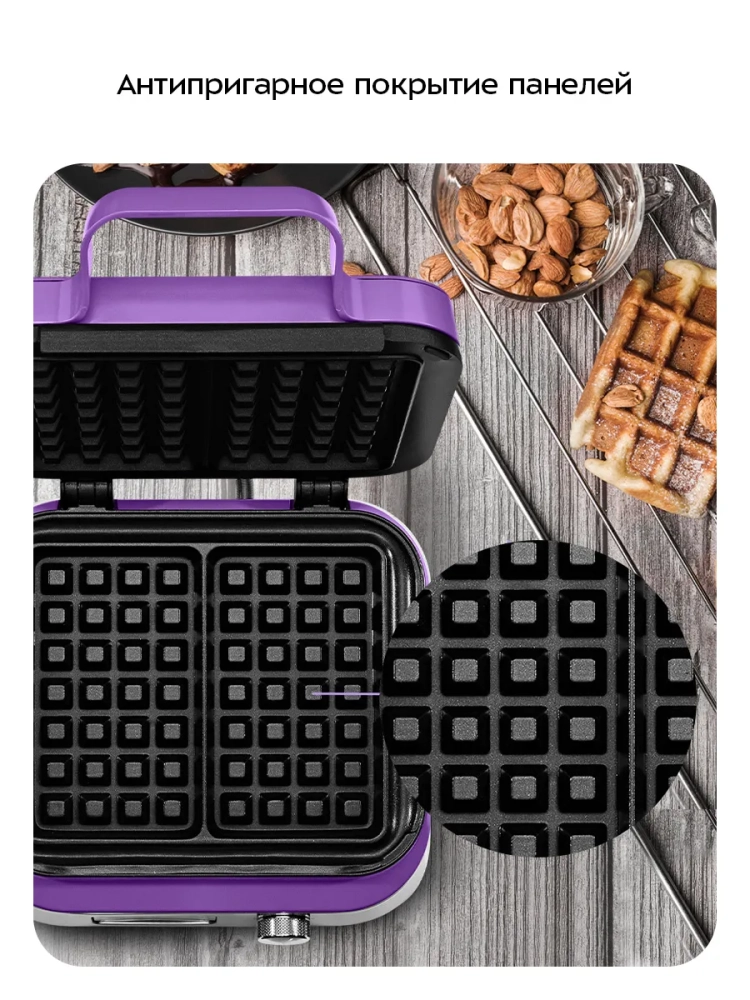 Антипригарное покрытие панелей вафельницы не дает прилипнуть тесту в процессе приготовления и позволяет готовить с минимальным количеством масла. Также антипригарное покрытие облегчает чистку панелей. Вафельница оснащена термостатом для поддержания температуры панелей.