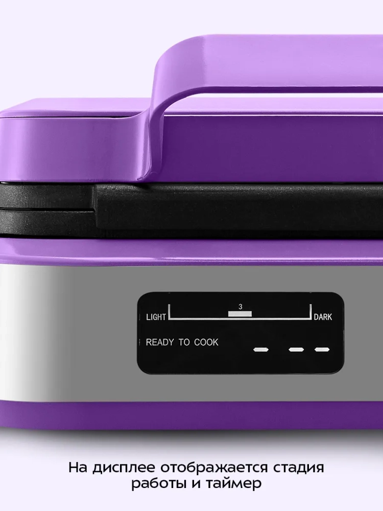 Данная модель оснащена регулятором, который позволяет настроить время приготовления вафель. На дисплее отображается текущая стадия работы, выбранная ступень времени приготовления, а также таймер приготовления.