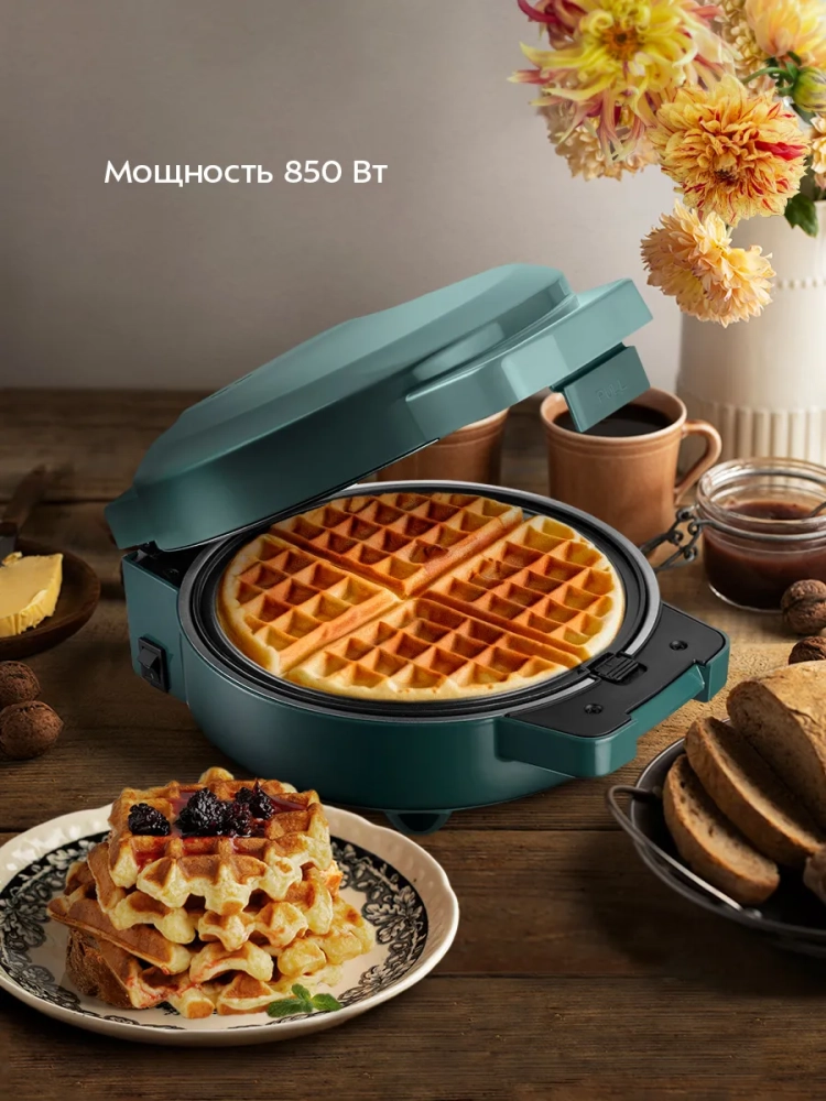 Вафельница оснащена индикаторами питания и нагрева, а также термостатом для поддержания температуры панелей.