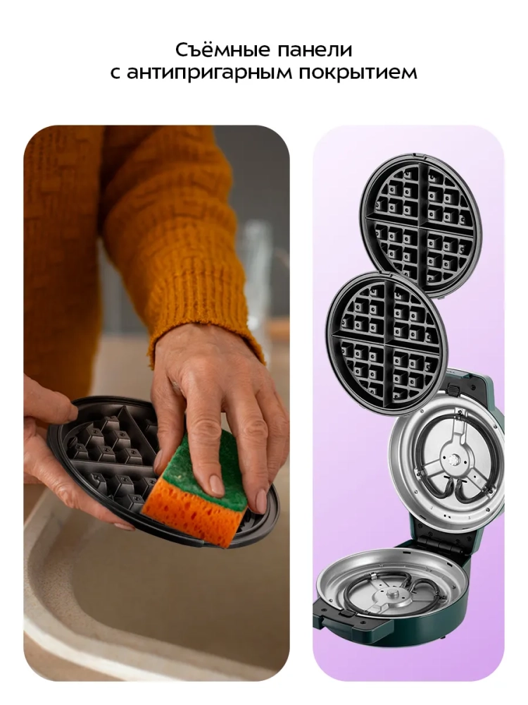 Антипригарное покрытие панелей вафельницы не дает прилипнуть тесту в процессе приготовления и позволяет готовить с минимальным количеством масла. Также антипригарное покрытие облегчает чистку панелей. Для удобства ухода панели сделаны съемными — их можно мыть под проточной водой.