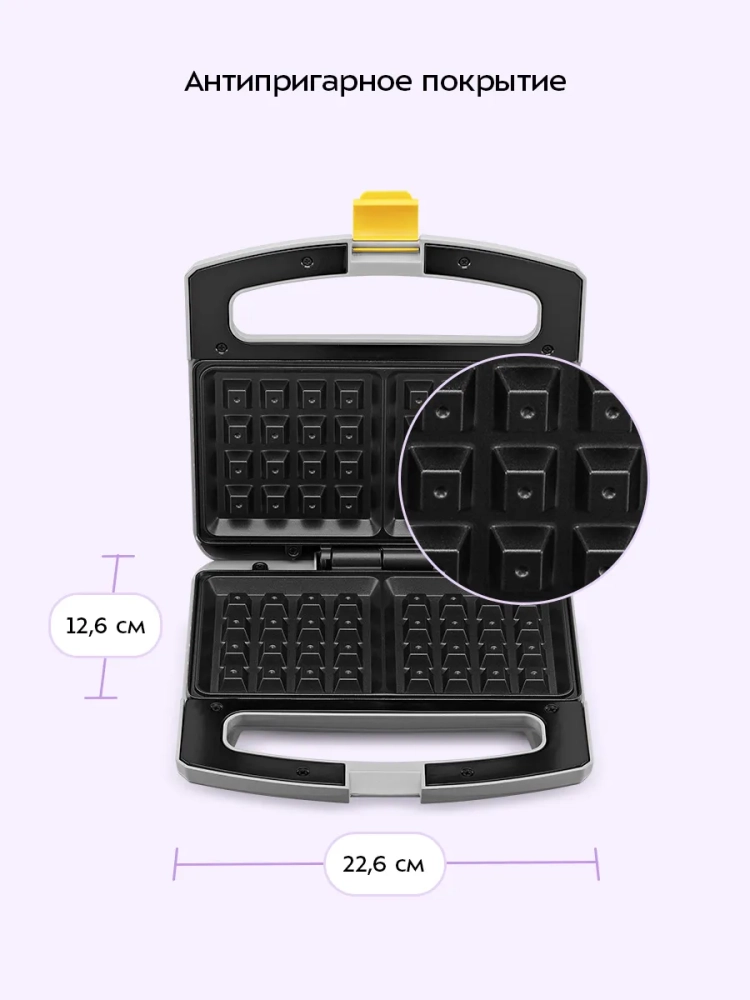 Антипригарное покрытие панелей вафельницы не дает тесту прилипнуть в процессе приготовления и позволяет готовить с минимальным количеством масла. Также антипригарное покрытие облегчает чистку панелей. Вафельница оснащена индикаторами питания и нагрева, а также термостатом для поддержания температуры панелей.