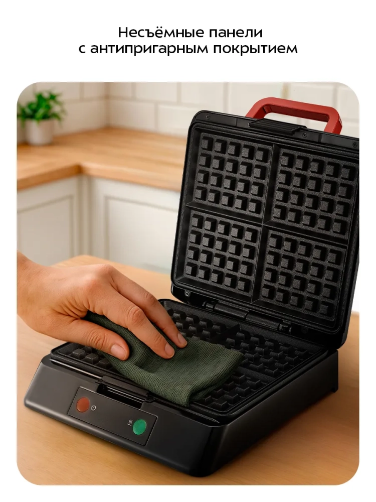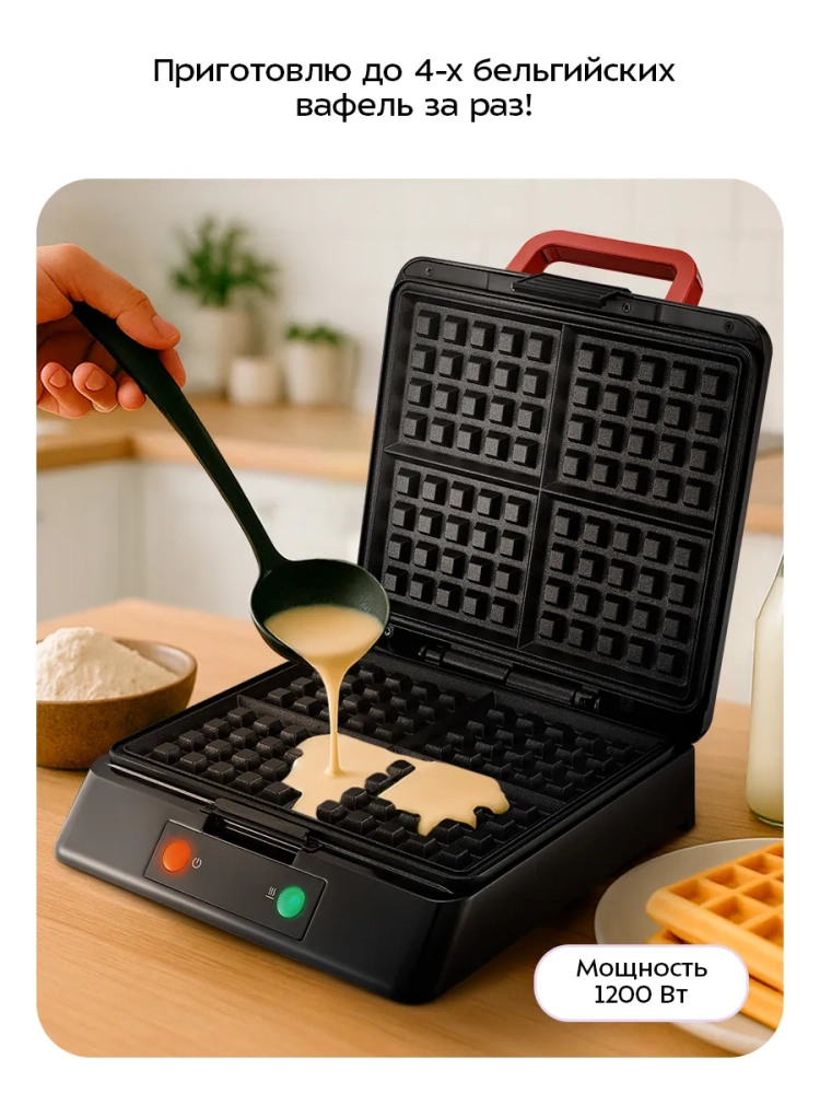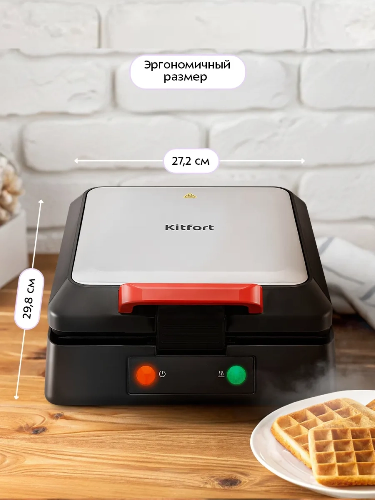 Электрическая вафельница Kitfort КТ-4674 — это идеальное решение для любителей бельгийских вафель. С её помощью вы сможете приготовить сразу 4 аппетитные вафли за один раз, что делает её отличным выбором для большой семьи или дружеской компании. Антипригарное покрытие панелей гарантирует, что тесто не прилипнет в процессе приготовления, а также позволяет использовать минимальное количество масла, что делает ваши вафли более полезными и лёгкими. Это же покрытие значительно упрощает процесс чистки устройства после использования. Вафельница оснащена индикаторами питания и нагрева, которые помогут вам контролировать процесс приготовления и избежать перегрева. Термостат поддерживает оптимальную температуру панелей на протяжении всего времени работы прибора. Фиксатор крышки обеспечивает надёжное закрытие во время готовки, предотвращая случайное открывание. Эта модель работает от сети с напряжением ~220–240 В и частотой 50/60 Гц при мощности 1200 Вт. Она относится к классу защиты I от поражения электрическим током, что гарантирует безопасность использования в домашних условиях. Длина шнура составляет 0,7 м — достаточно для удобного размещения на кухне. Размеры панелей составляют 240 х 205 мм, а габариты самого устройства — 272 х 298 х 125 мм. Эти параметры делают электровафельницу компактной и удобной для хранения даже в небольшой кухне. Если вы ищете надёжную кухонную электро вафельницу с современным дизайном и множеством функций для комфортного использования дома или на даче — обратите внимание на эту модель от китфорт! Она станет незаменимым помощником в приготовлении вкусных десертов.