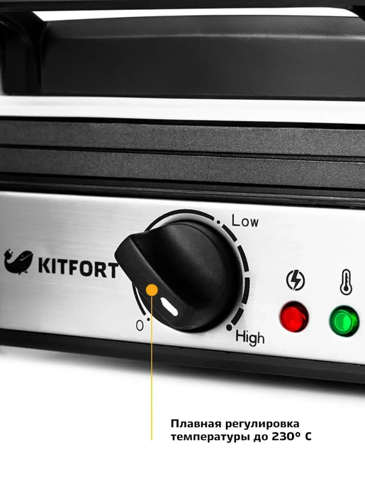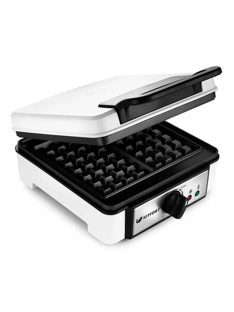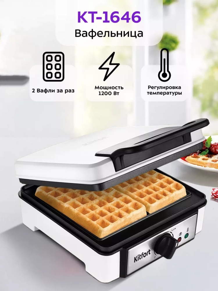 С помощью электрической вафельницы Kitfort KT-1646 можно испечь толстые бельгийские вафли. Вафельница оснащена индикатором питания, термостатом для поддержания постоянной температуры поверхностей и индикатором, показывающим включение и отключение нагрева. В вафельнице установлены независимые нагреватели в каждой половинке формы. На нижней части корпуса предусмотрено место для хранения шнура. Противоскользящие ножки не дают прибору скользить по столу во время готовки. Корпус выполнен из термоустойчивого пластика, а формы покрыты антипригарным покрытием.