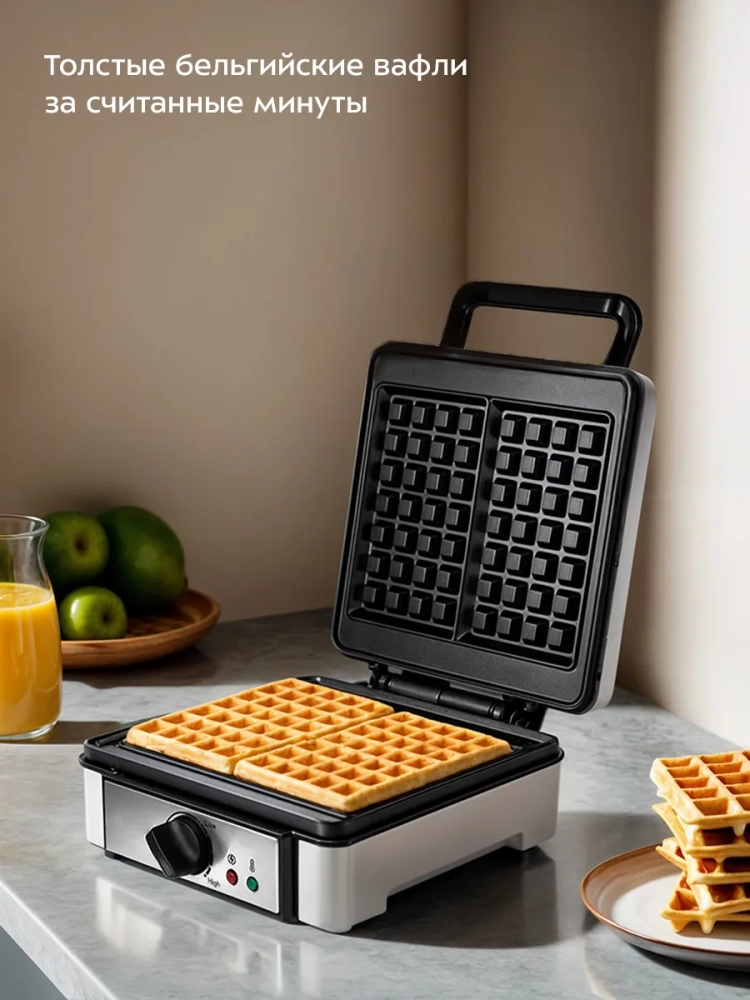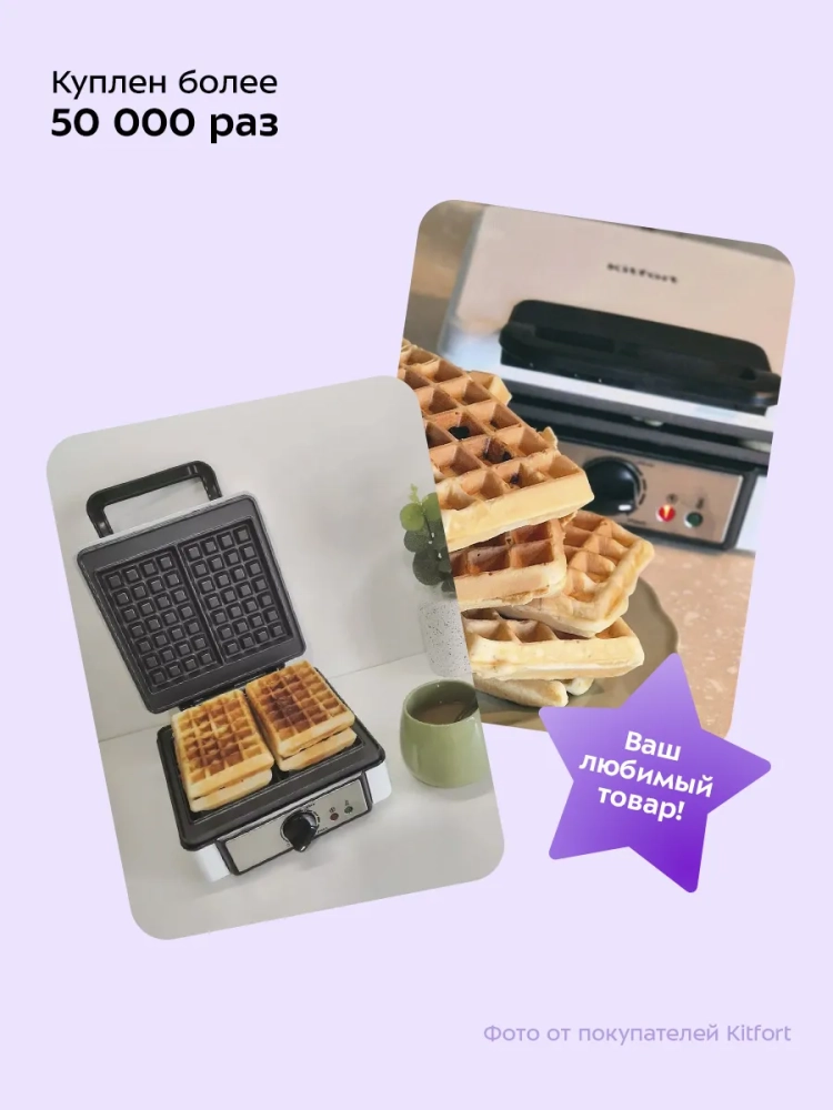 Электрическая вафельница Kitfort KT-1646 — это идеальный кухонный прибор для приготовления вкусных и пышных бельгийских вафель. Эта бытовая электровафельница оснащена индикатором питания, который позволяет контролировать процесс выпечки, а также термостатом для поддержания постоянной температуры. Встроенные независимые нагреватели в каждой половинке формы обеспечивают равномерное приготовление вафель. Корпус прибора выполнен из термоустойчивого пластика, что гарантирует долговечность и безопасность использования. Антипригарное покрытие форм предотвращает прилипание теста и облегчает уход за устройством после использования. Противоскользящие ножки обеспечивают устойчивость на любой поверхности, не позволяя прибору скользить во время готовки. Эта электрическая вафельница от Kitfort также имеет удобное место для хранения шнура на нижней части корпуса, что делает её компактной и удобной в хранении даже на небольшой кухне. С помощью этой электровафельницы вы сможете радовать себя и своих близких свежими домашними вафлями каждый день. Вафли получаются воздушными благодаря продуманному дизайну устройства, а простота управления делает его доступным даже для начинающих кулинаров. Независимо от того, хотите ли вы приготовить классические венские или экспериментировать с различными рецептами выпечки — эта бытовая техника станет вашим надежным помощником на кухне.